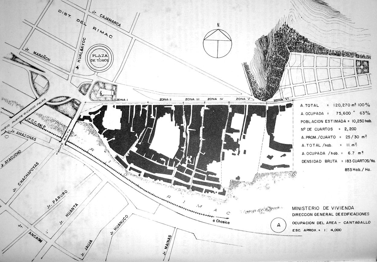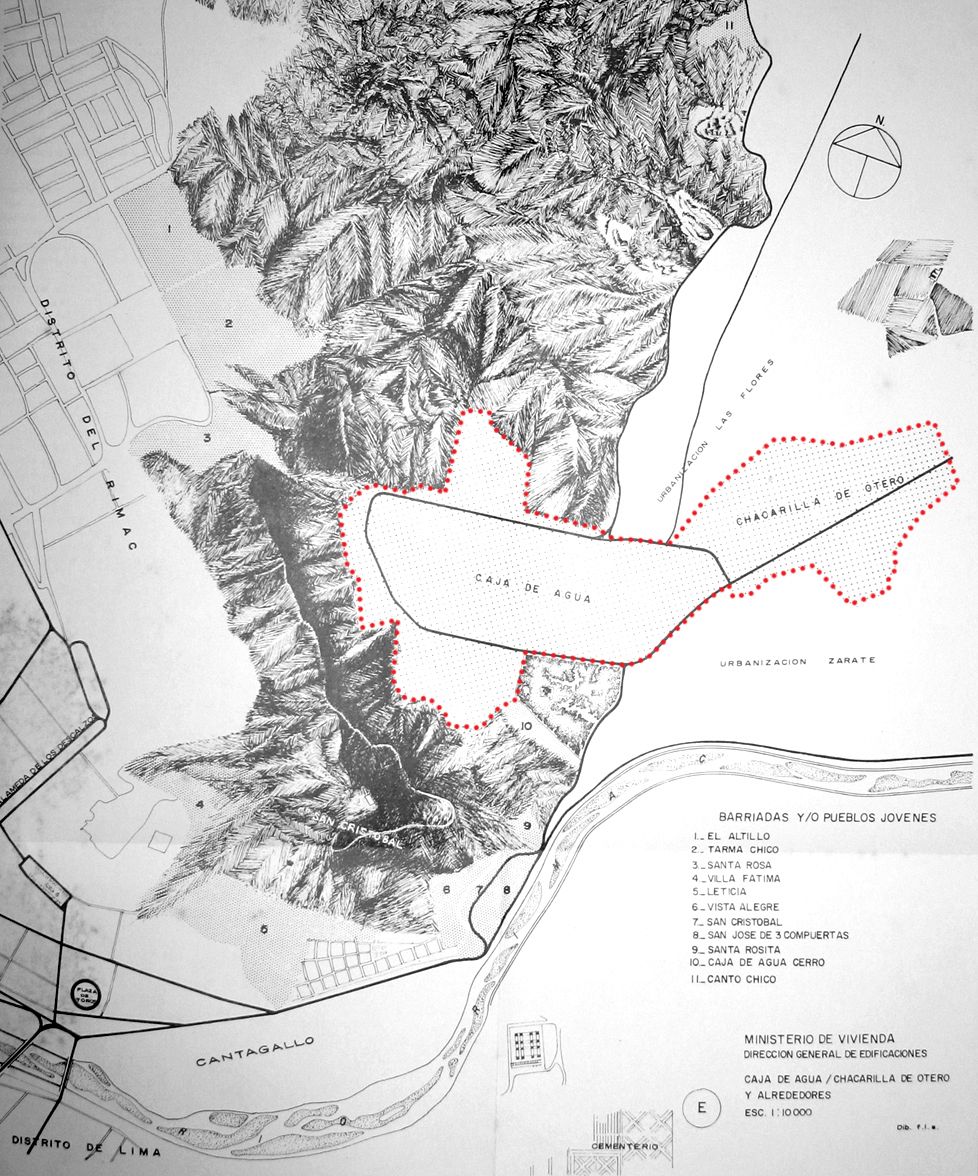 Delays due to administrative and funding issues postponed the implementation of Caja de Agua until 1965, at which time it was decided to supplement the project’s 1,596 lots with several hundred additional lots on a neighbouring site, Chacarilla de Otero. Together these two projects were intended to rehouse residents from Cantagallo, a barriada housing over 2,000 families that had arisen on a private estate bordering the Río Rímac in the centre of Lima. Cantagallo was overcowded, with an average density of 890 people per hectare living in improvised low-rise housing, and its communal facilities were limited to two sports fields, two small markets and a number of bars. Due to its proximity to the city centre, multifamily housing was deemed more appropriate for this valuable site (although this was never built; the site now houses government facilities).