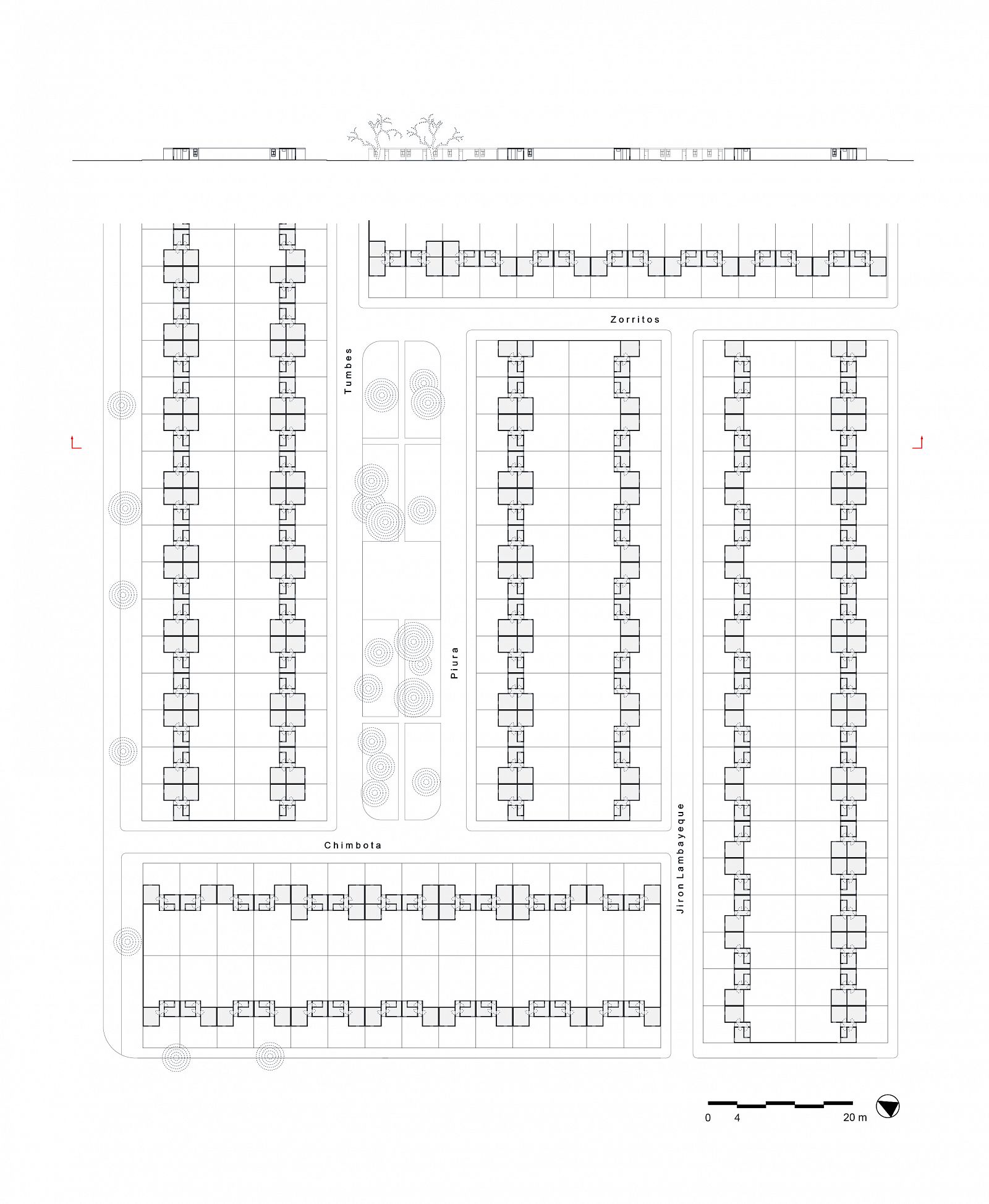 The new plan envisaged much lower density, at 124 people per hectare, and provided for a large number of amenities, including parks, schools, a health post, market, sporting facilities and churches. The housing, built on 8 x 20-m lots, was arranged in blocks of 18 to 24 units, organized to frame a series of open spaces, where the parks, schools and other amenities would eventually be built. However, the plan only indicated the location of these services without guaranteeing their actual execution, which was often left to residents and various public and private entities; as a result, a report on the two settlements after five years of occupancy reported that only a few had been completed.