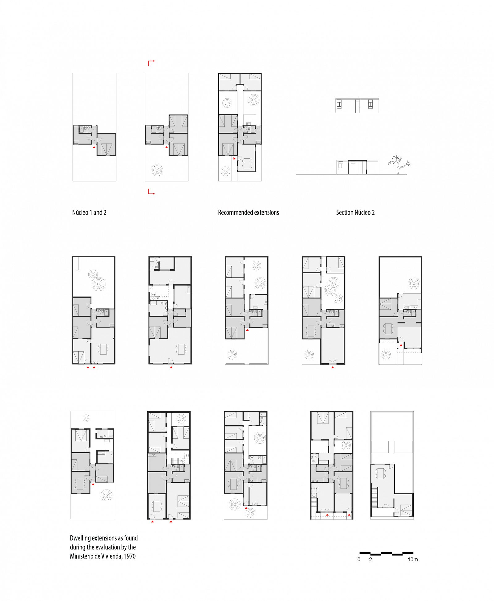 The housing agency prepared a recommended plan for the completed house – foreseeing a living-dining room adjacent to the kitchen, a front garden, a garden patio and two additional bedrooms at the rear. However, in the absence of technical assistance, residents developed their own solutions for the expansion of the house. The post-occupancy report noted that within five years, 94 per cent of residents had begun to make additions, the majority adding between four and six rooms; in part this was achieved by enclosing elements such as the garden patio. Many were subdividing their properties for rental income, raising concerns that the proliferation of subleasing and the ever-increasing density marked the first step towards replicating the environment of Cantagallo. For the authors of the report, this drive to maximize household earnings generated unambiguously negative urban consequences. In conclusion, they observed that the emerging patterns of development at Caja de Agua called for a better balance between individual autonomy in managing the growth of the house and maintaining a certain coherence in the streetscape and the neighbourhood as a whole. Yet in the absence of overarching planning controls, this difficult negotiation was never resolved.