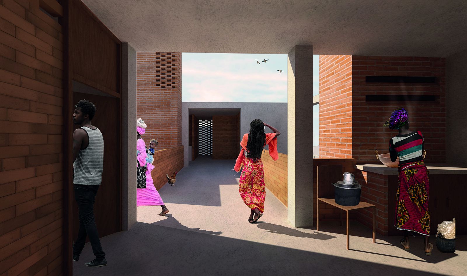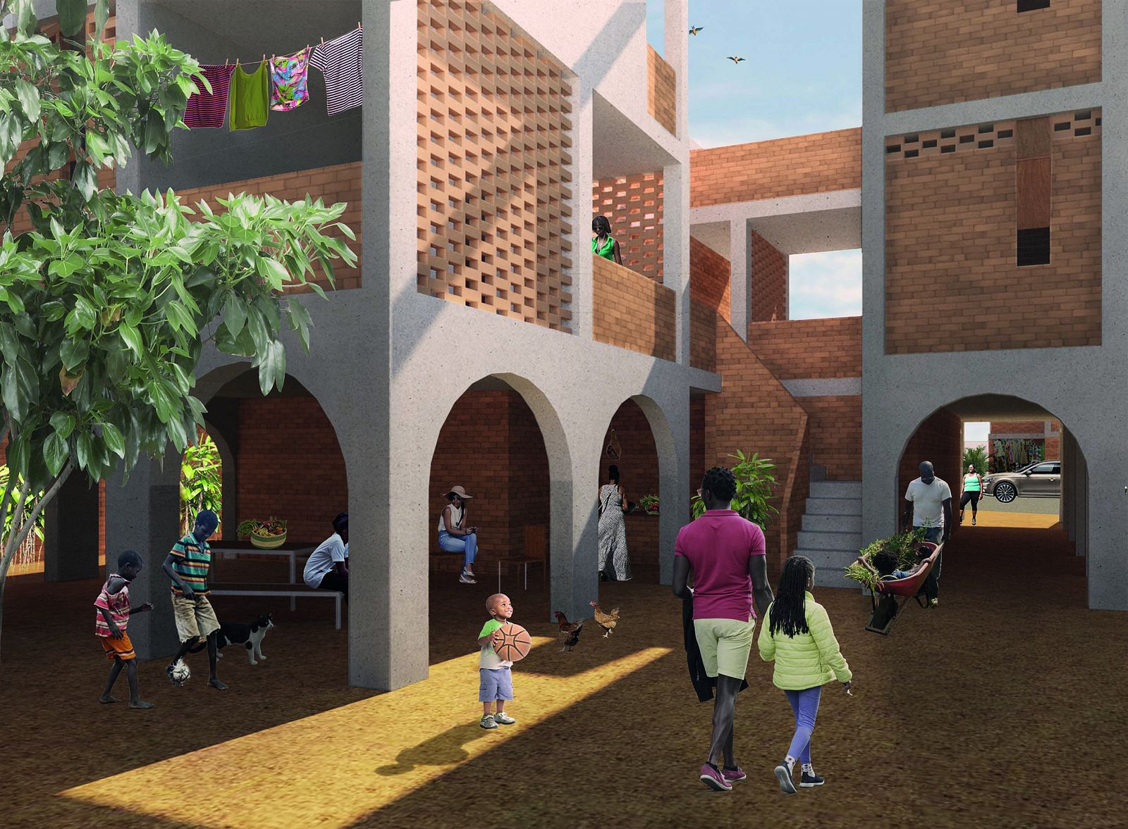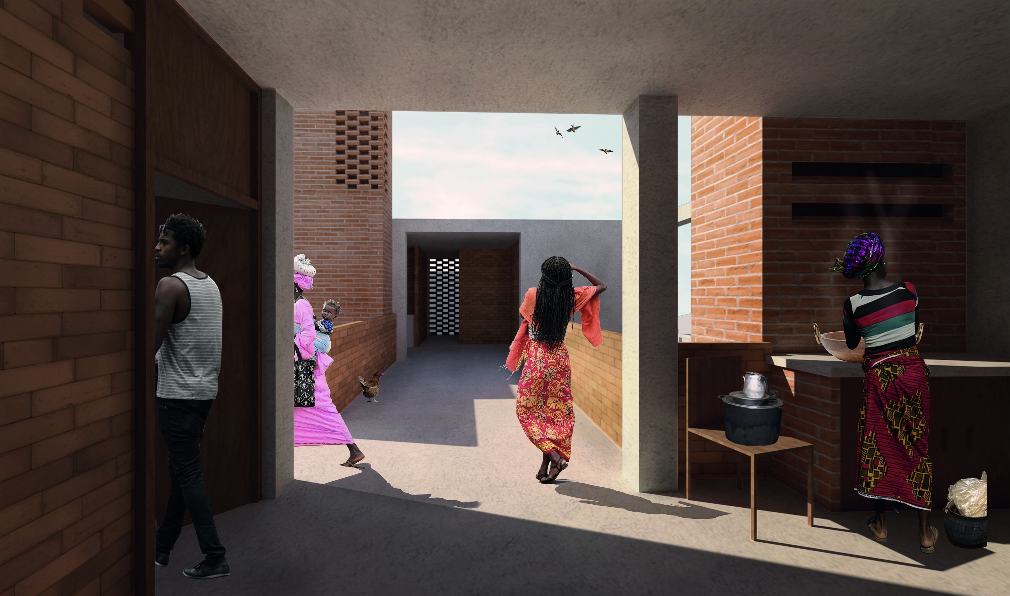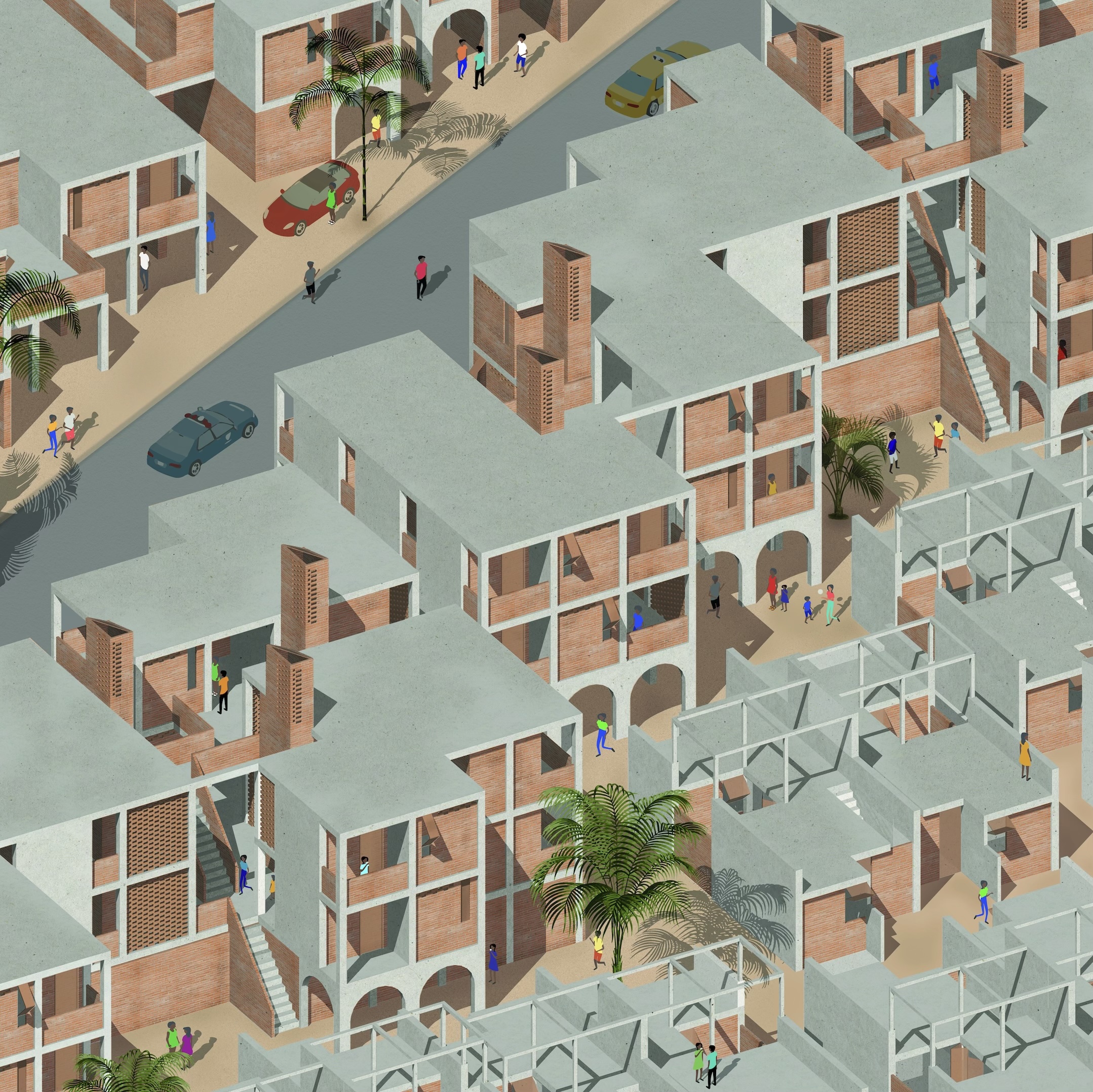 The core focus of our project is to revive Community II in Tema by focusing on creating a core spine of activities and interactions. Commercial activity is encouraged at the edge of the road with market spaces designed around the core principles of a bazaar. This aims to help low-income families generate revenue, meanwhile creating a strong community atmosphere. Moreover, the market works as a filter between the chaotic public realm of the street and the semi-public condition of the squares behind. Above the market lie low income housing structures: these are clustered in a way that reflects the traditional arrangement of close-knit extended families in Ghana. The structured grid helps to keep costs low, and means standardised, pre-fabricated materials can be used to ensure a fast construction. The concrete frame allows inhabitants the flexibility to expand their homes with ease. Solar chimneys are used to help draw stale air out of the building and to facilitate ventilation. In the in-between back space, the implementation of middle income housing is arranged to provide income diversification and to encourage social interaction within the neighbourhood.