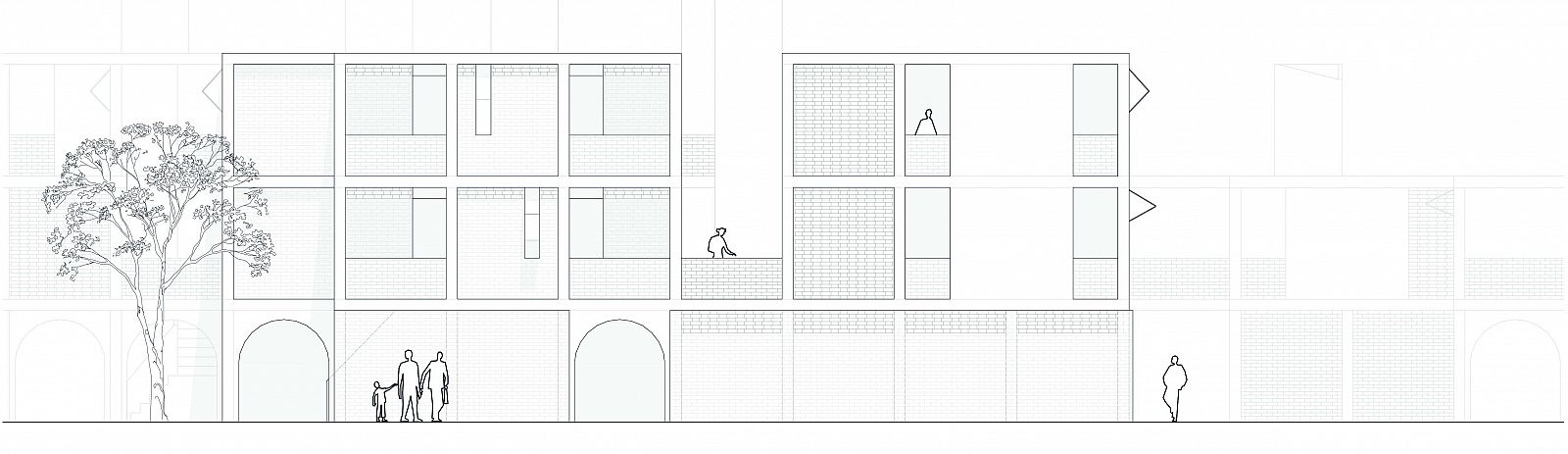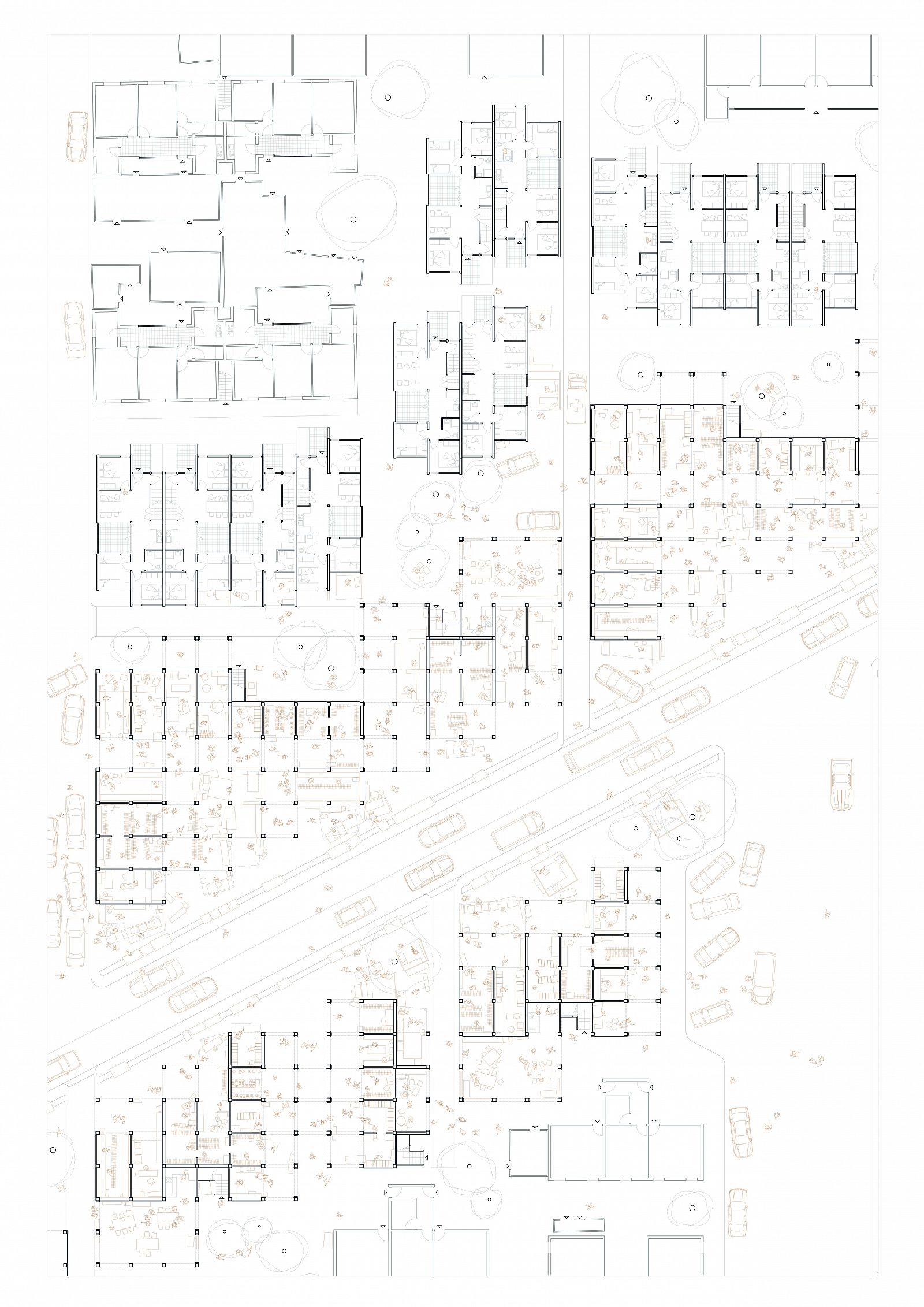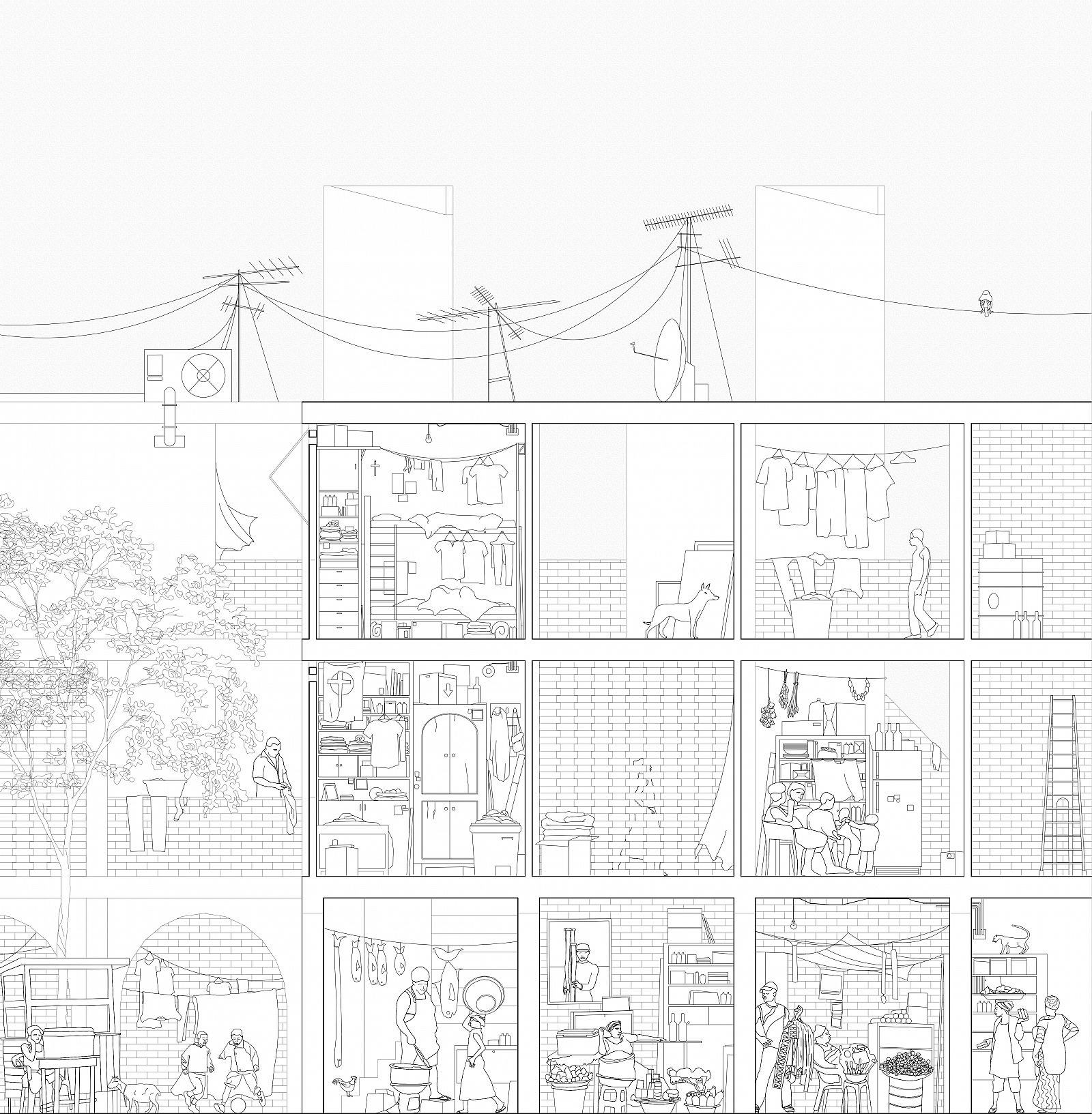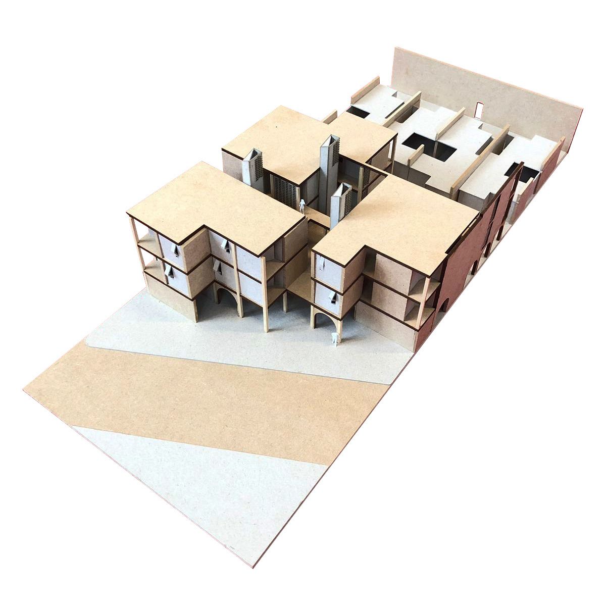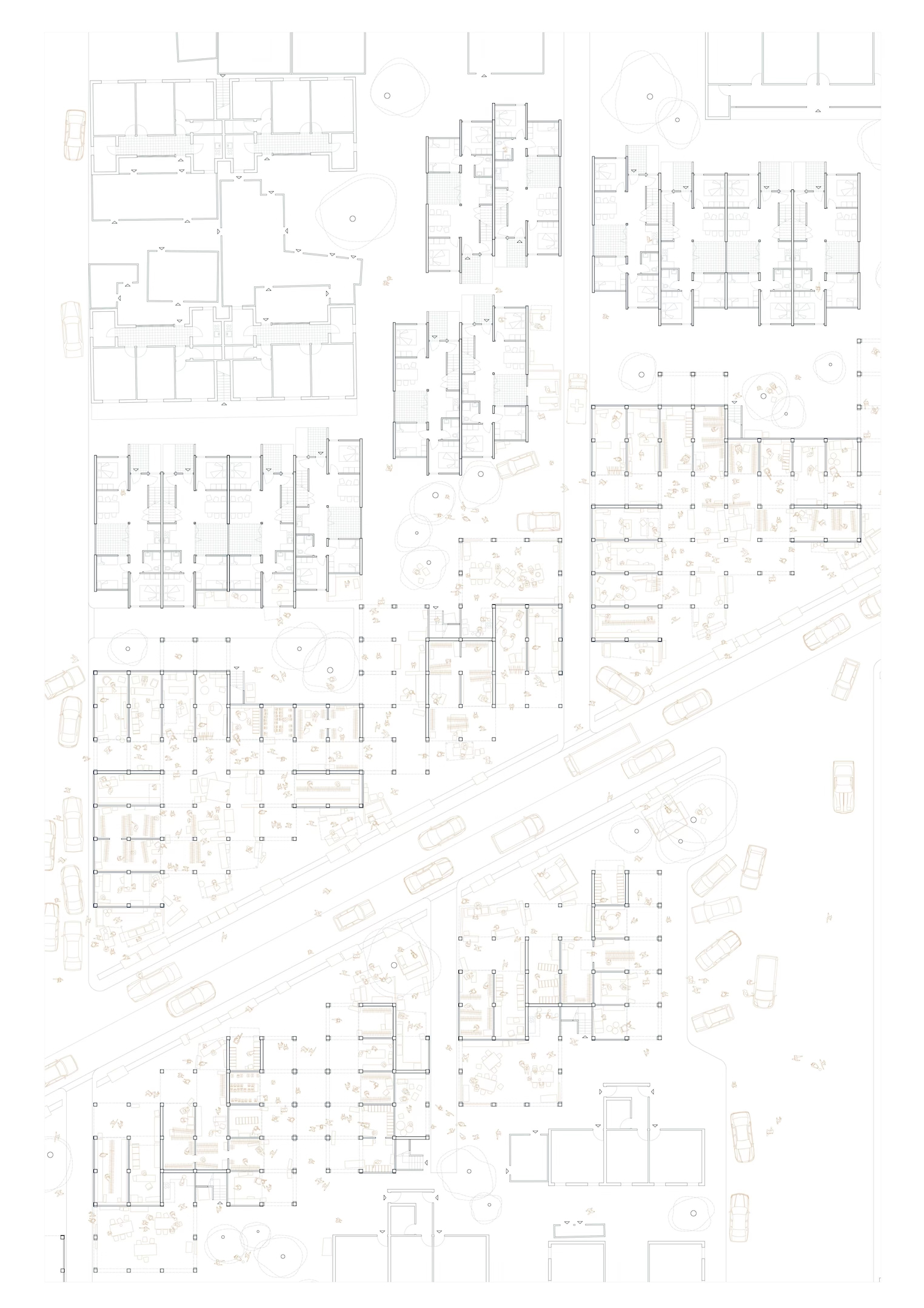 The core focus of our project is to revive Community II in Tema by focusing on creating a core spine of activities and interactions. Commercial activity is encouraged at the edge of the road with market spaces designed around the core principles of a bazaar. This aims to help low-income families generate revenue, meanwhile creating a strong community atmosphere. Moreover, the market works as a filter between the chaotic public realm of the street and the semi-public condition of the squares behind. Above the market lie low income housing structures: these are clustered in a way that reflects the traditional arrangement of close-knit extended families in Ghana. The structured grid helps to keep costs low, and means standardised, pre-fabricated materials can be used to ensure a fast construction. The concrete frame allows inhabitants the flexibility to expand their homes with ease. Solar chimneys are used to help draw stale air out of the building and to facilitate ventilation. In the in-between back space, the implementation of middle income housing is arranged to provide income diversification and to encourage social interaction within the neighbourhood.