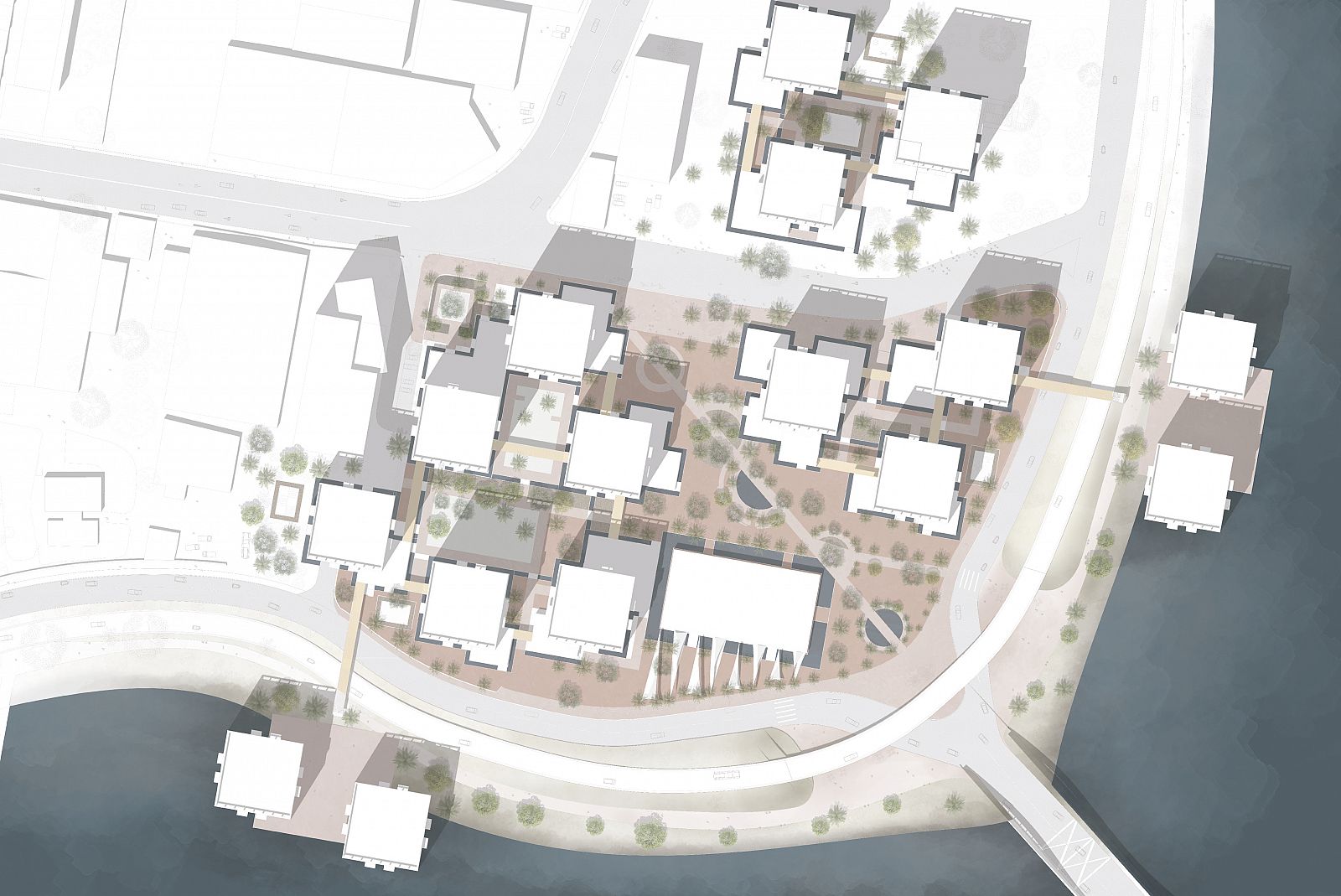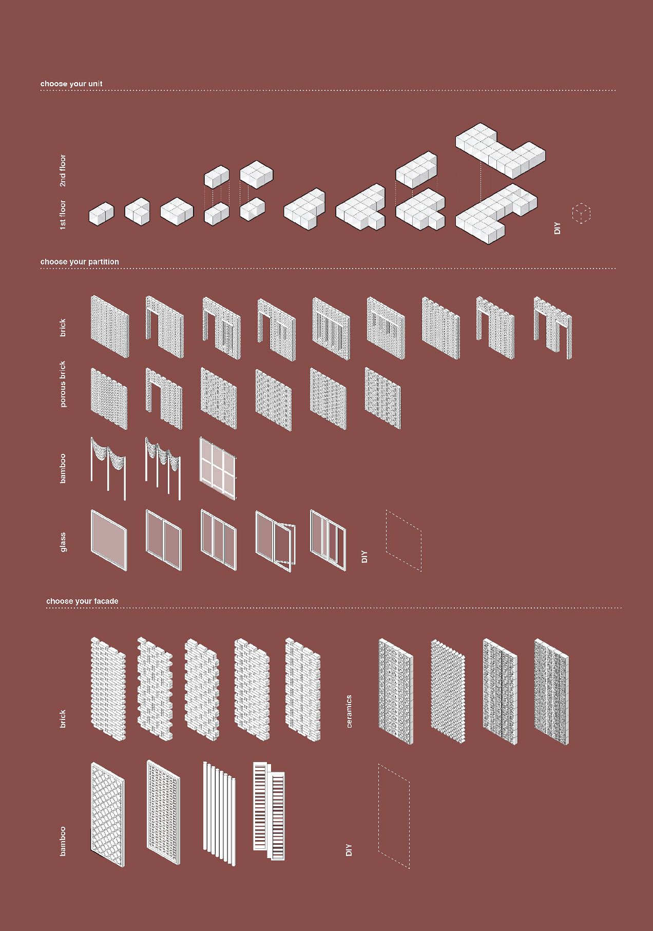 To ensure that the provided structure can house all income groups, we adopted the principles of the primitive hut and the clothing of space. This can happen in a low budget way, with textiles and mudbricks or sealed with double glazed panorama windows. To achieve a coherent appearance, the facade panels have to be made out of bamboo, brick or ceramics.