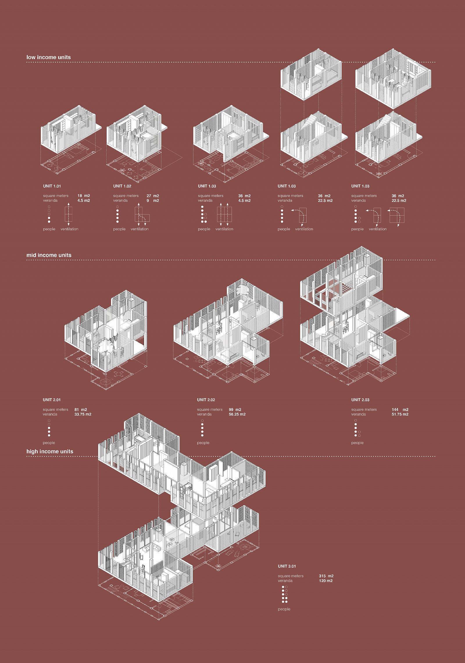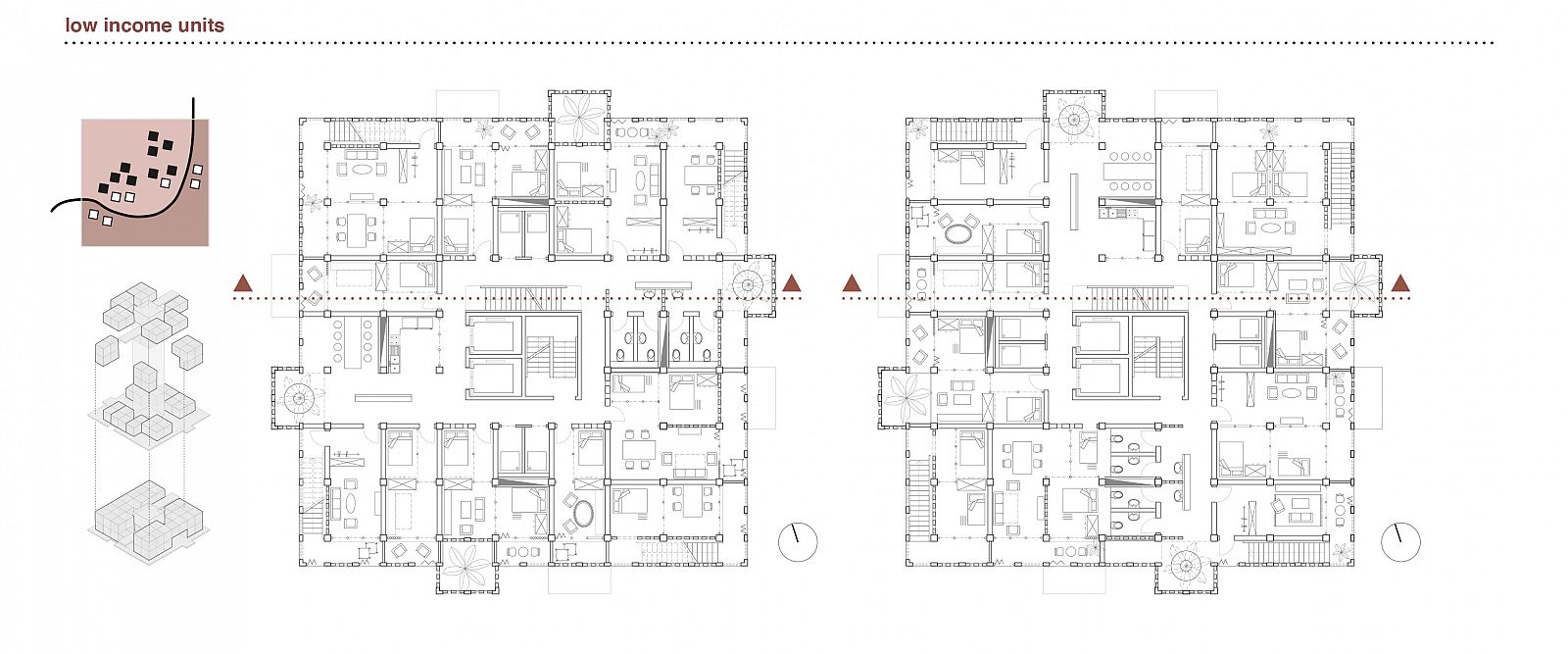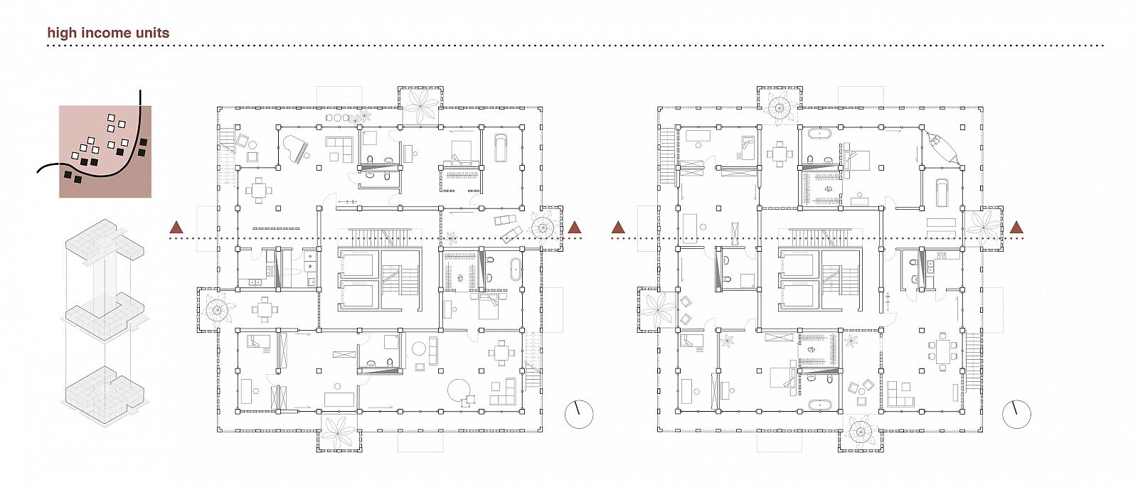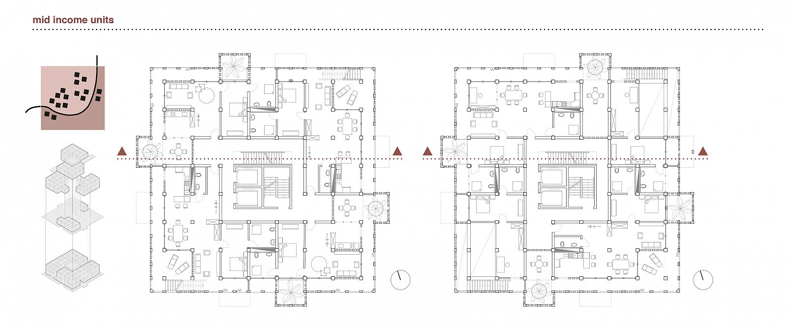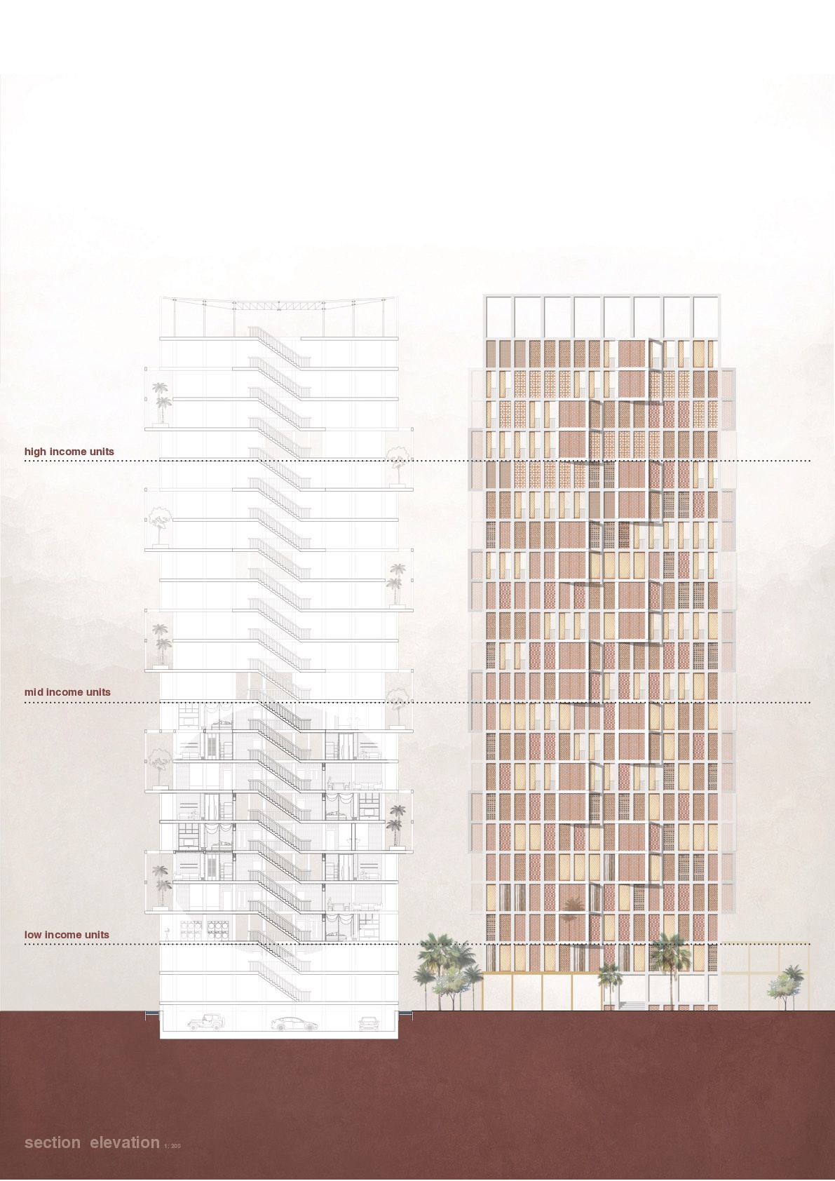 A structural framework that consists of a service core and every second floor slab, enables the inhabitants to create their own space, depending on their income and preferred unit size. To avoid forced integration, one tower should only cater for either low- and mid or mid- and high-income groups. However the social spaces or urban commons, the places in between, connect them all.