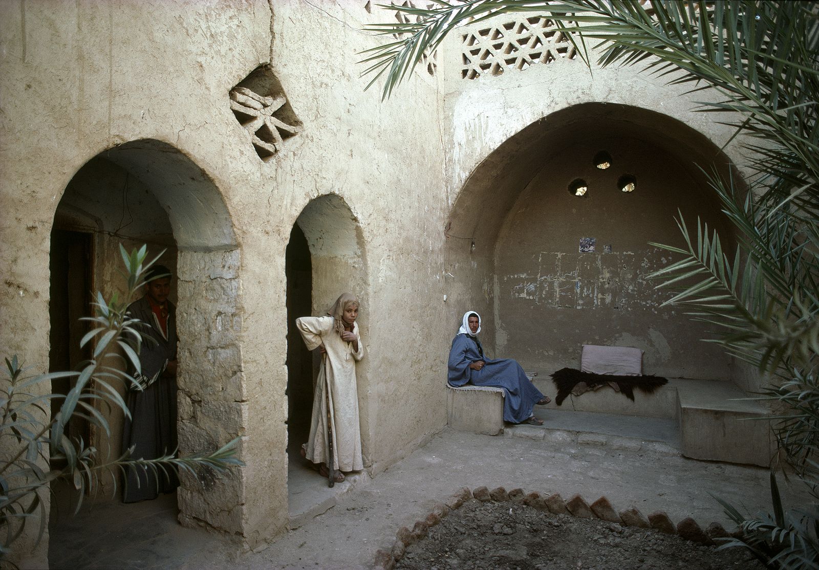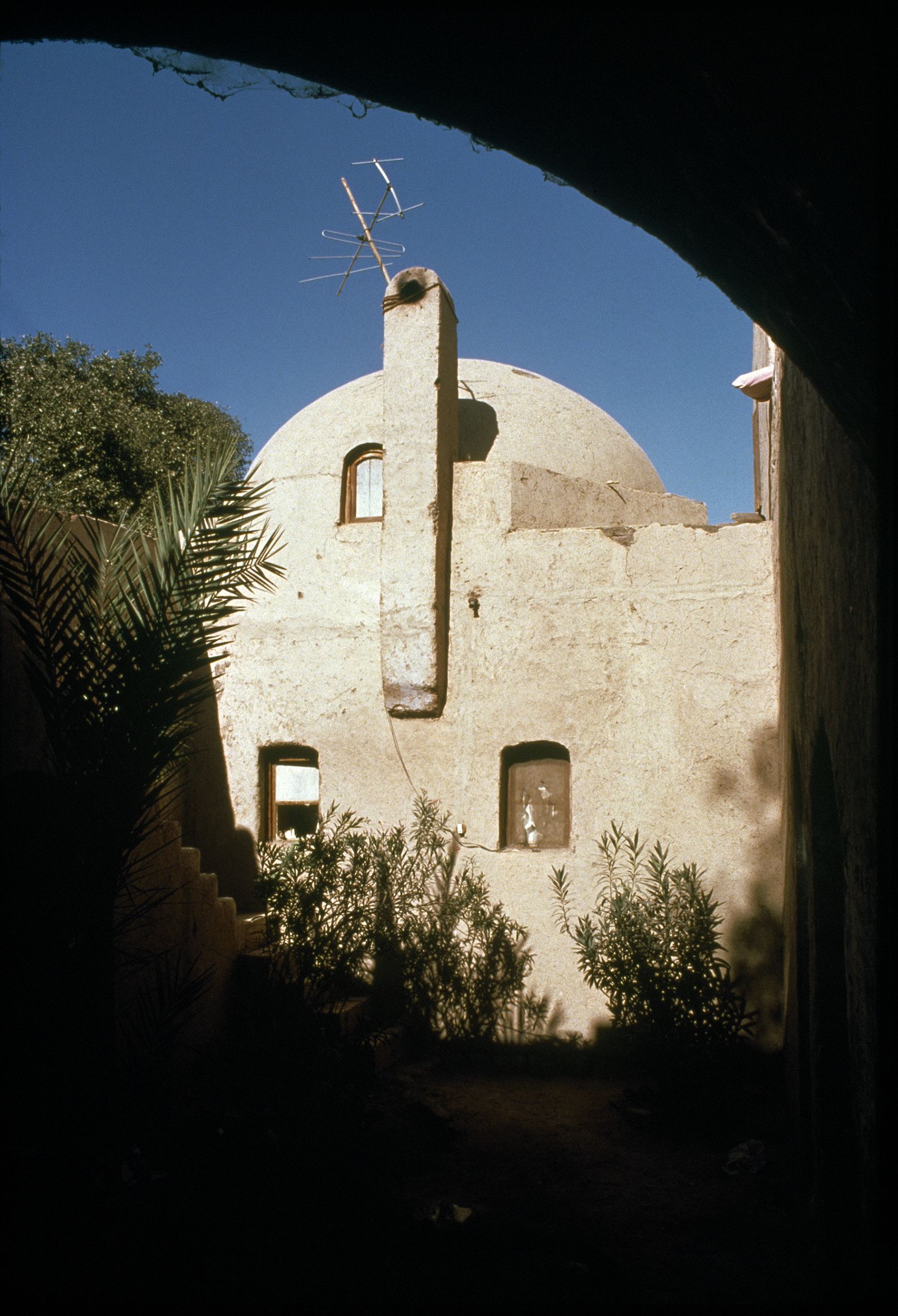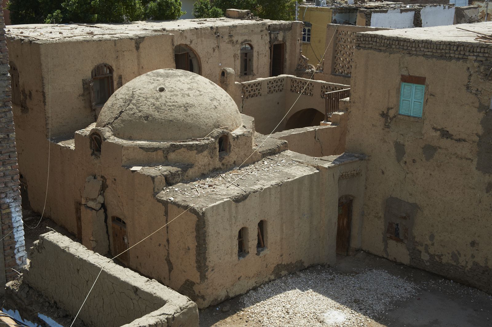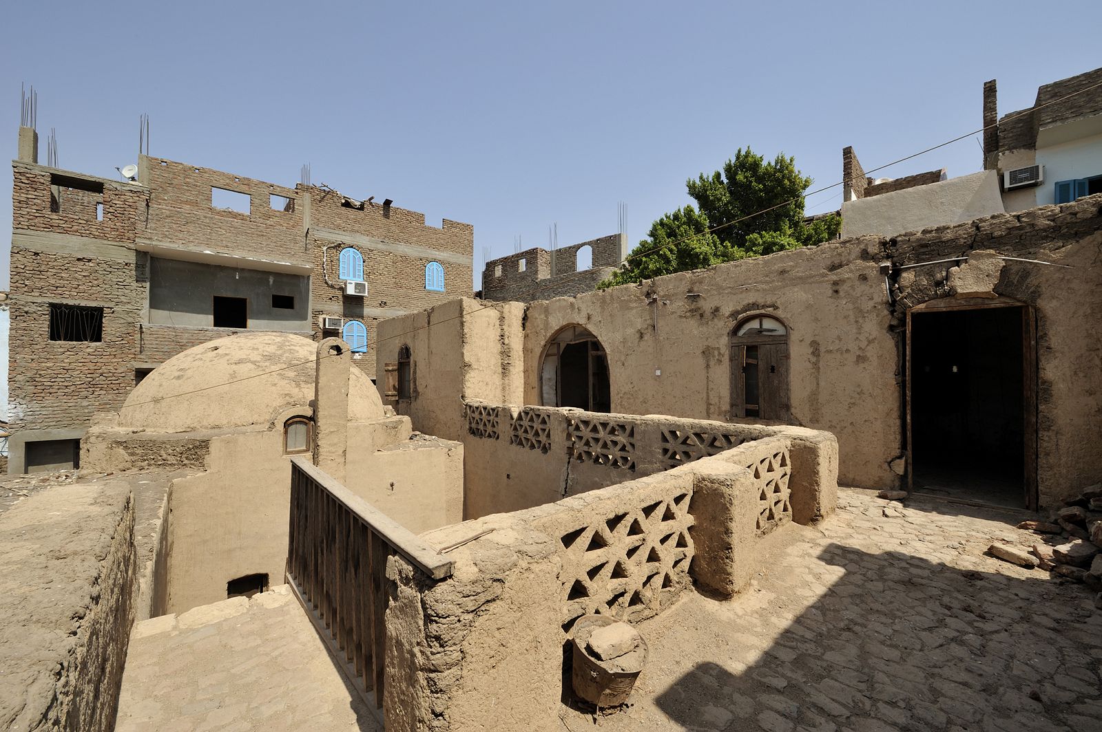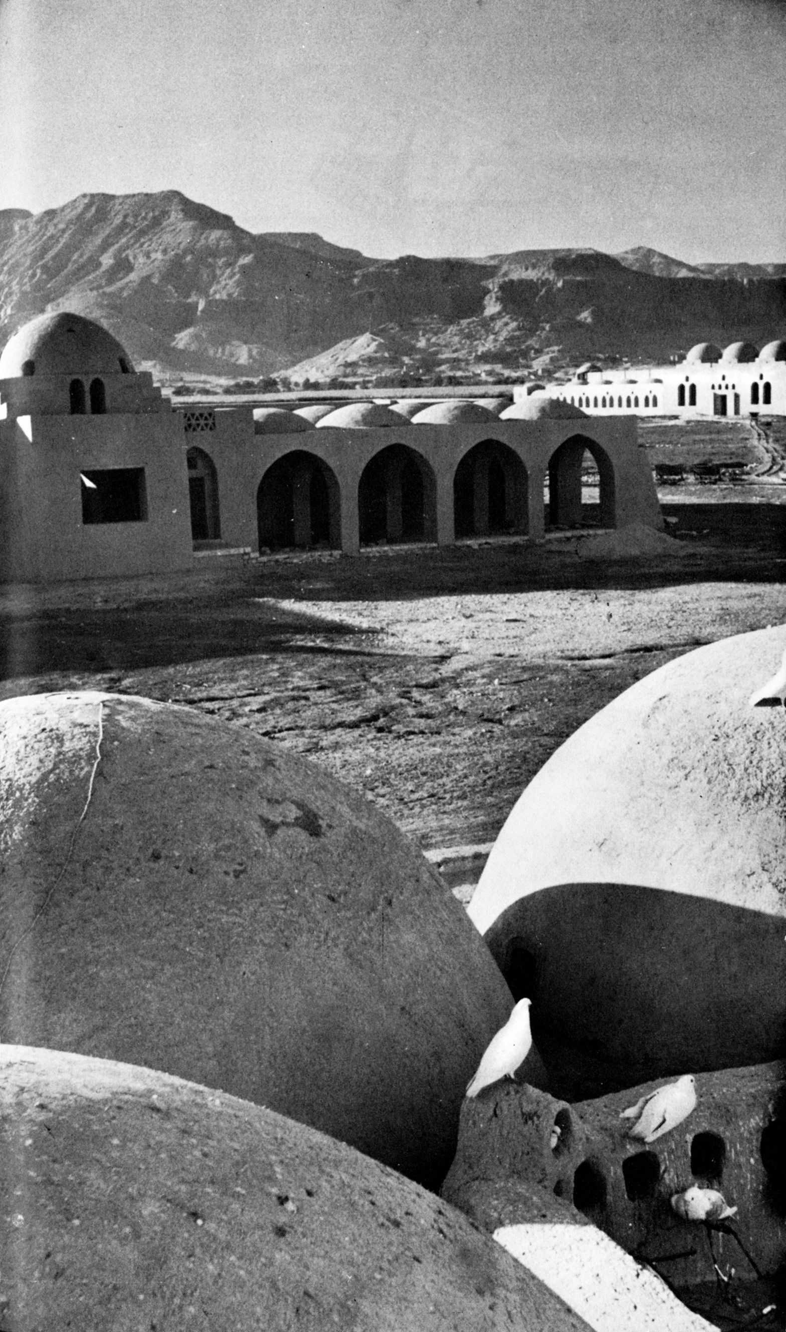All buildings in New Gourna are built entirely of mud bricks – a cheap and locally available material. The pit dug to acquire the mud was integrated into the urban plan to serve as a lake. When building with mud bricks, it is best to choose domes and arches as construction elements: the rectangular rooms inside the dwellings, including the bedrooms, therefore have domed roofs. Each of the beds is in an alcove (iwan) fit with a special gutter that offers protection from scorpions. Many dwellings include an indoor space for livestock on the ground floor. The plan included the realization of both dwellings and countless amenities including a Kahn (an inn and trading place for caravans), a mosque, a primary school for boys and a separate school for girls.