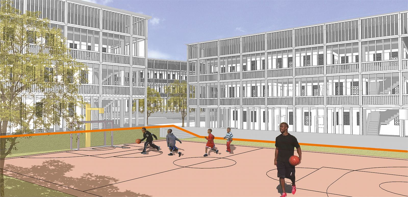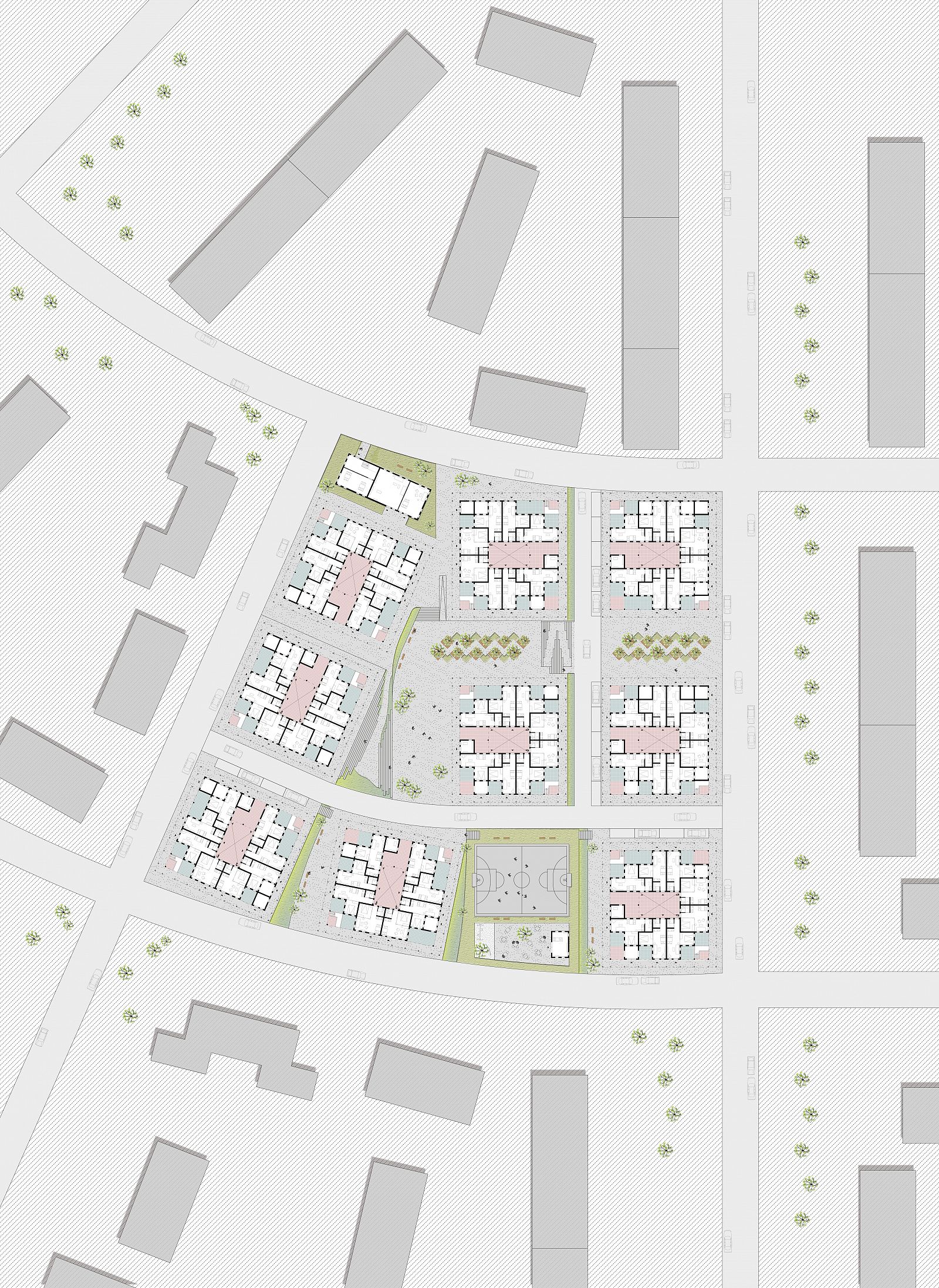 Urbanisation is the one word that describes best what is currently happening in Africa. Addis Ababa is one of the fastest growing cities in Africa: the number of inhabitants is rising fast. More and more people from the countryside move to the capital. This puts a lot of pressure on the city and causes several problems. One of these problems is the shortage of affordable housing. People are struggling to find a place to live in humane conditions. The number of slum settlements is growing. In order to give people a place to live with improved living conditions, a new type of affordable housing is needed. In 2006 the Integrated Housing Development Program was launched to create more affordable housing (Keffa, 2014). Informal settlements are destroyed and replaced by condominiums. Also in the outskirts of the city areas are cleared from farms, villages and greenery to be replaced by condominiums, large apartment blocks. Large groups of people from the inner city are moved to these new areas, such as Yeka Abado and Legetafo Area. However, the condominium neighbourhoods raise questions and bring along new problems: they differ from the original compound and countryside structures. The system of the condominium neighbourhoods needs critical reflection and improvement. Program, basic infrastructure and human scale needs to be taken into account. To critically reflect and find methods to improve the current condominium neighbourhoods, research on several elements of both the condominium neighbourhoods and slum settlements is needed. The elements of research on the slum settlements will focus on ‘general’ aspects of slum settlements, while the research on the condominiums neighbourhoods will use Legetafo Area as a case study. Part of this research is comparing condominium neighbourhoods in the outskirts of the city with (successful) condominium neighbourhoods in the city centre and the original compound structure currently found in the slum settlements. Using the themes of boundaries, scale, proportion, proximity, density, social spaces, building technologies and income generation, will contribute in forming a design proposal. The design has been developed in trying to provide an alternative design within the condominium neighbourhoods to improve living conditions and create a good functioning and mixed neighbourhood that provides the base for a strong social structure.