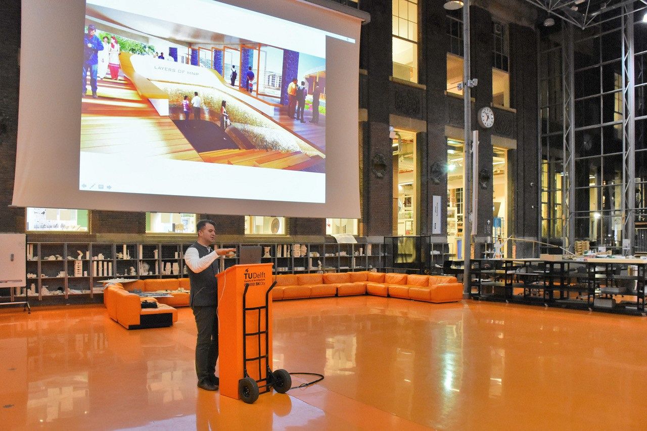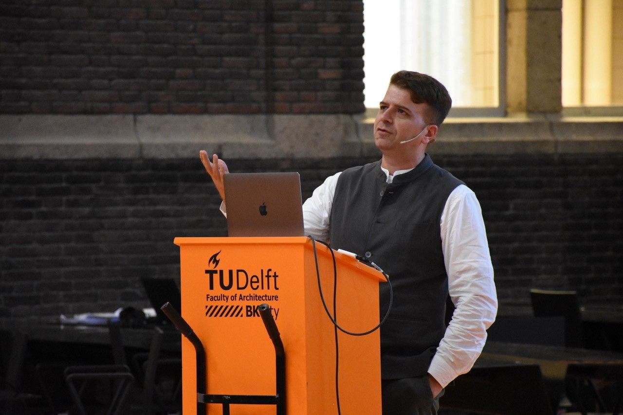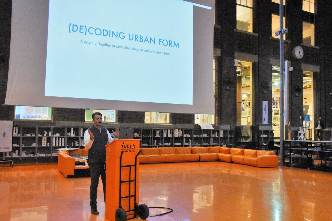Sameep Padora speaking during the Berlage Thursdaynight lecture series at TU Delft