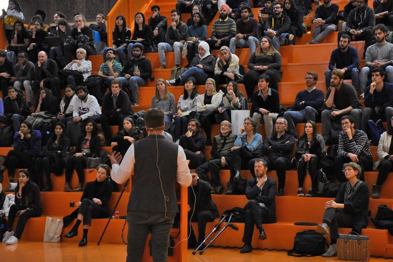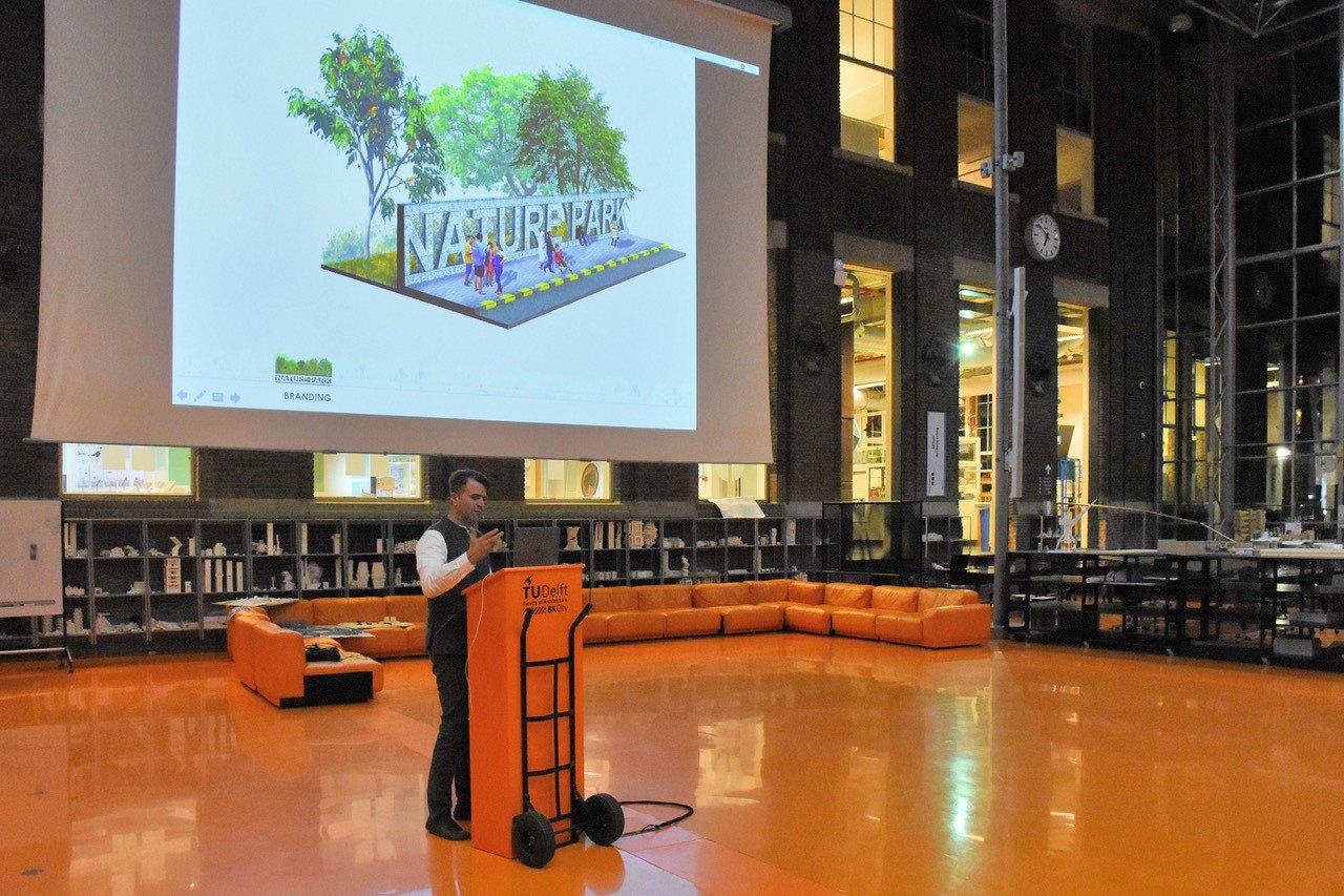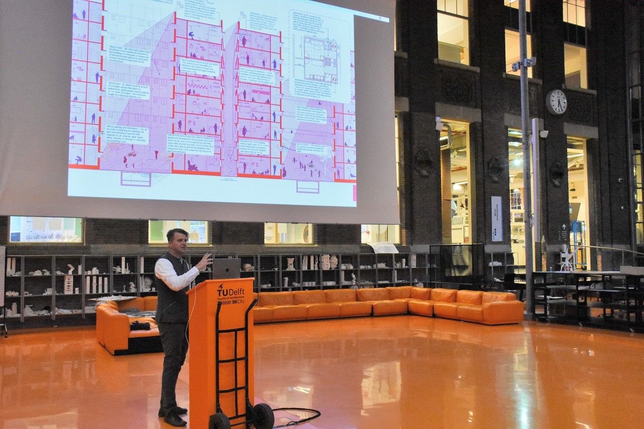 Sameep Padora speaking during the Berlage Thursdaynight lecture series at TU Delft