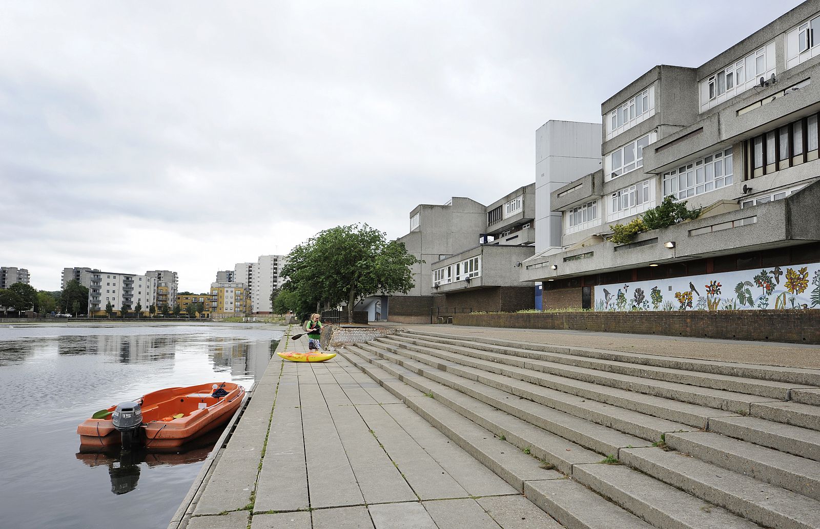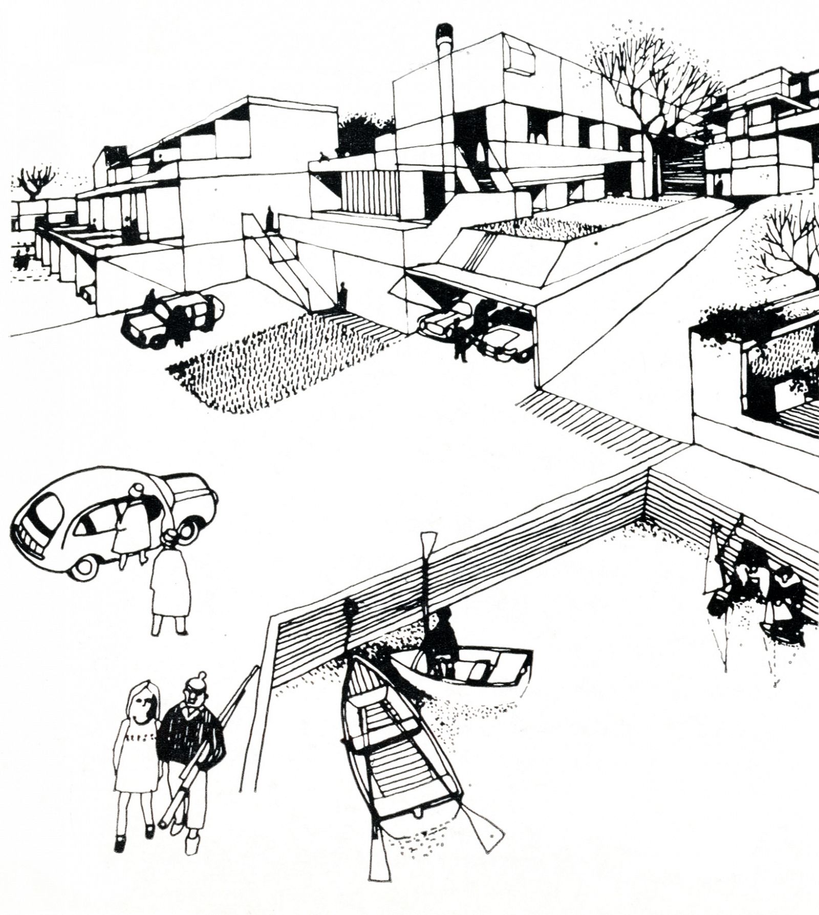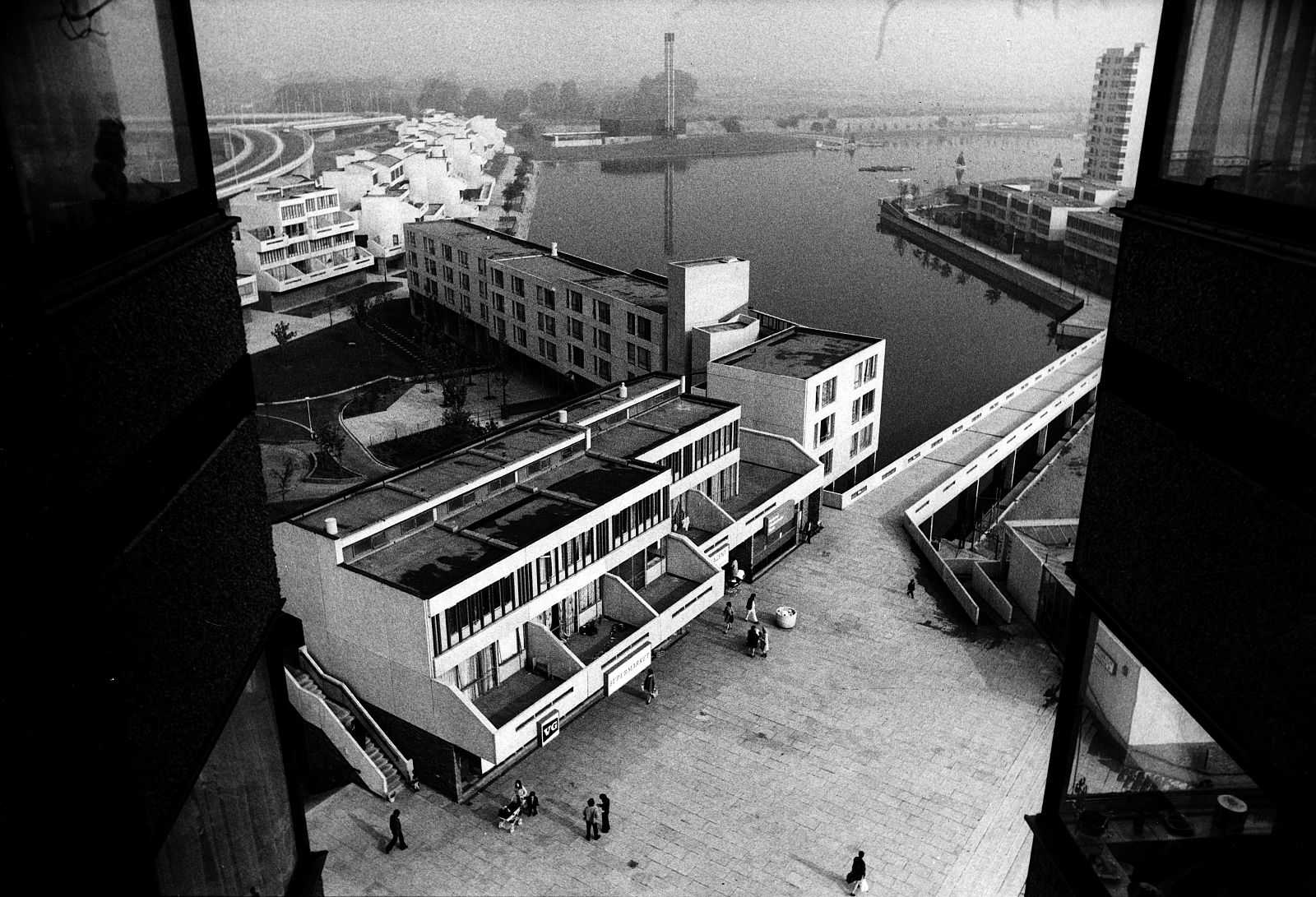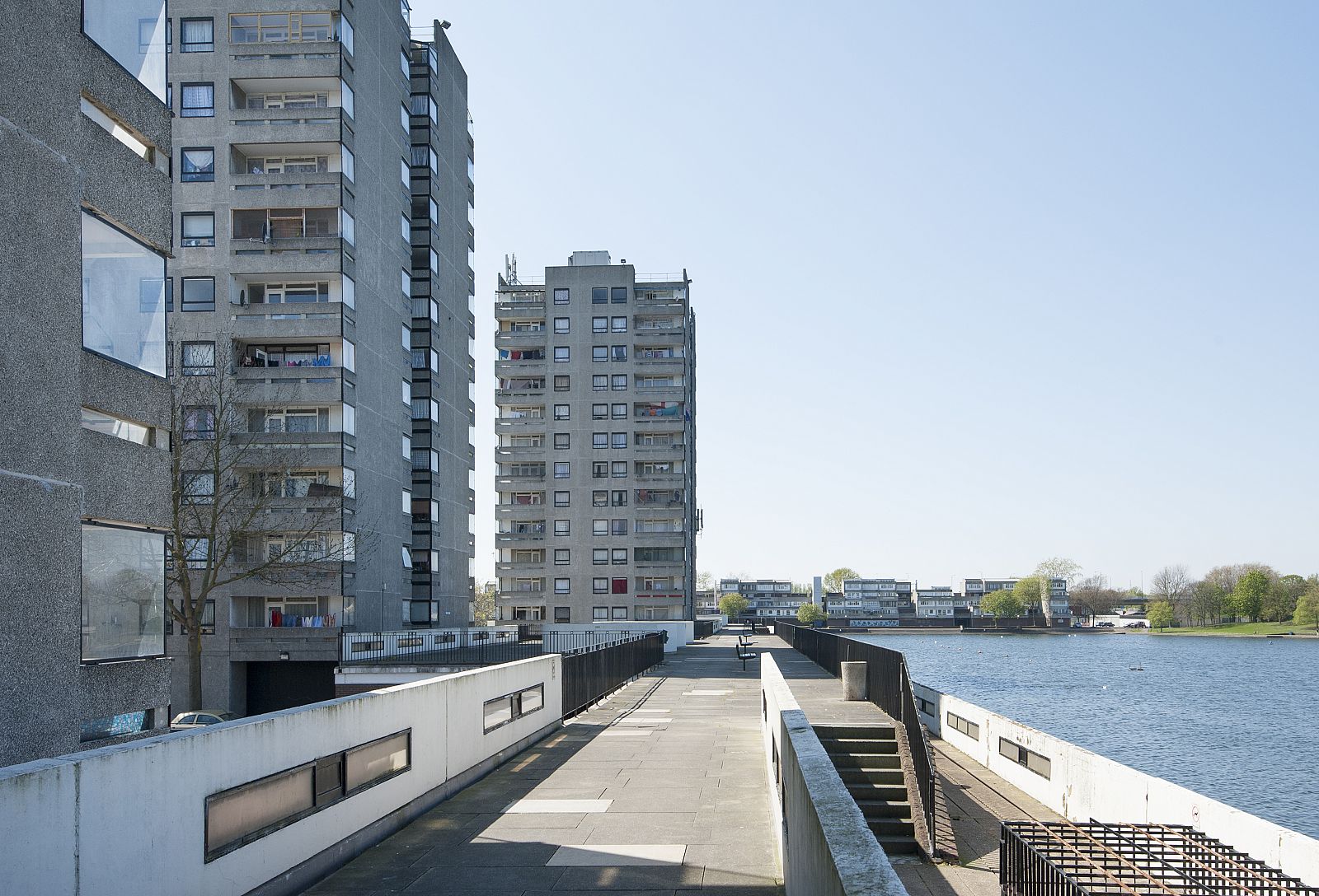 In the mid-1960s, the Greater London Council (GLC) initiated the setup of a programme and design of a New Town for no less than 60,000 people in East London: Thamesmead. After the First World War, the GLC had begun the large-scale demolition of inner-city slums consisting of Victorian back-to-back dwellings built for the working classes. This slum clearance process continued through the 1950s, 1960s and 1970s. Thamesmead was intended, among other things, for the resettlement of families from the cleared neighbourhoods. The location of the new residential area was to be the site of the Woolwich Royal Arsenal, which had fallen into disuse. This originally low-lying wetland area between the River Thames and the Abbey Wood hills had been deemed unfit for large-scale development for years due to poor soil conditions and the danger of flooding. However, lack of space and a high-pressured housing market changed all that and the location was developed despite the risks. Unlike the first generation of English New Towns, which was considered monotonous even then, Thamesmead was to become an example of the ideal New Town, with a wider variety of building typologies as well as more space for employment and services. The original 1967 master plan shows a large number of long-meandering blocks, the so-called spine blocks that form the back bone of the district: a long string of buildings along the Thames with branches going inland converging in a large central area around a marina by the river. The spine blocks created a wind and noise buffer for the low-rise neighbourhoods lying behind them, while offering a safe traffic route from the residential areas to the centre through an internal system of raised pedestrian roads. In accordance with the then prevailing opinion that the separation of traffic types through a raised pedestrian circuit would result in a safer living environment (which was also applied, for instance, in the London Barbican, see DASH – The Urban Enclave), an internal system of routes through the spine blocks was developed. In the case of Thamesmead this was in perfect keeping with the requirement that because of the danger of flooding, there were to be no residential spaces on the ground floor and escape routes had to be present at every level. The other restrictions of the location are also used to beautify the neighbourhood and make it more liveable. An intricate system of water courses was proposed for the purpose of water storage; the boggiest areas were transformed into small lakes. In advance of the construction on location, building firm Cubitts put a factory in place for the production of prefab elements to allow the quick building of a large number of houses. Only the first phase of this ambitious master plan, Thamesmead South, was realized. In accordance with the master plan, the spine blocks are situated along the north south through route in the direction of the planned centre on the Thames. The complex composition, with a lot of height differences and staggered façades and balconies, provides the blocks with a varied and expressive exterior. Located on top of the parking garage is a raised pedestrian deck flanked alternately by stacked maisonettes and one-storey dwellings for seniors. Bridges also connect the deck to the community centre by the lake and to parts of the two raised neighbourhoods behind it. Here, in a repetitive pattern of staggered short blocks, single-family dwellings are clustered around parking courts or, alternatively, green, car-free courtyards. To achieve the required housing density, a number of identical residential towers housing single or double households are situated along the fringes, some along the south shore of the lake and some along the east-west access road. In the early 1970s, high construction costs and new insights led to drastic changes in the master plan: the shopping mall, the marina and the new cross-river connection were dropped. The Cubitts factory was closed and later residential areas built in accordance with more organic home-zone principles. Thamesmead South has been struggling with a negative image for many years. As it turned out, the design ideals worked out badly in practice. The raised ground level, for instance, led to a deserted ground floor with a lot of unsafe or inaccessible areas. Only a few years after the completion of the project, the recording there of some illustrious scenes for the Stanley Kubrick film A Clockwork Orange confirmed that image. Today, many of the prefabricated concrete dwellings are highly outdated technically and some of them have passed into private hands through the ‘right to buy’ system. Overdue maintenance and the many individual additions make the neighbourhood look cluttered and neglected. The current owner of the rental housing, the Peabody Trust housing association, recently announced a major restructuring of the area. In anticipation of this, part of the original community centre by the lake has already been demolished.