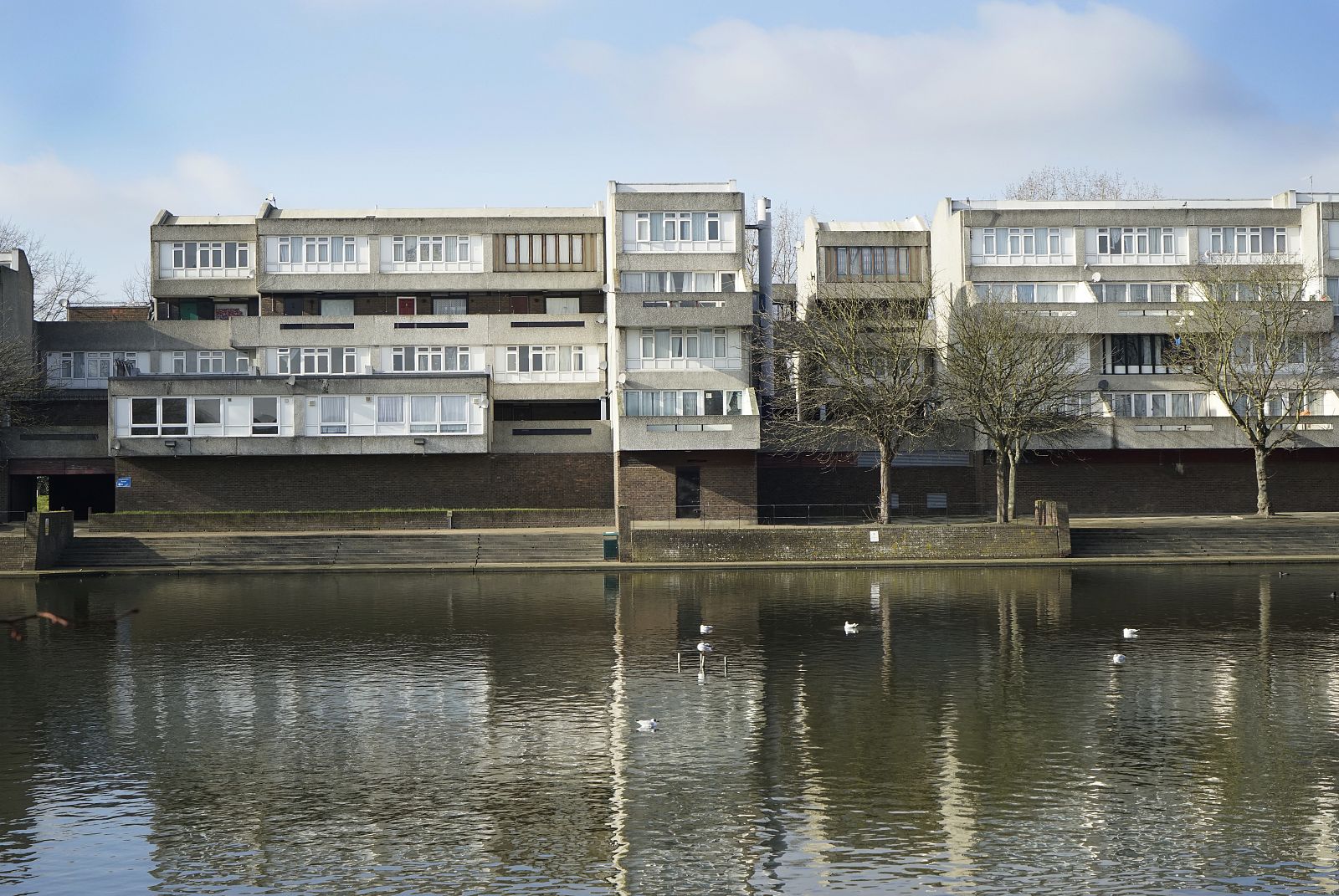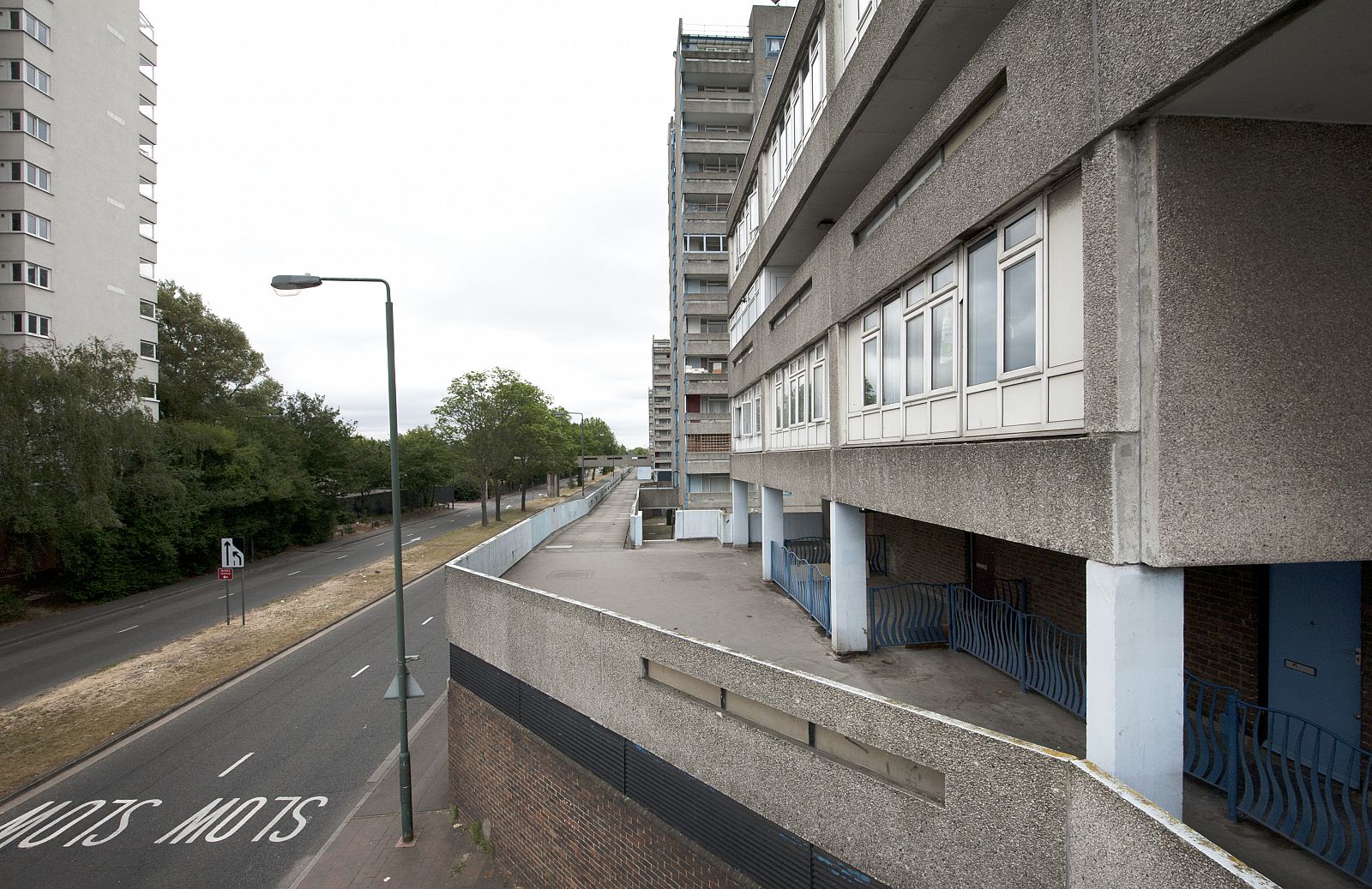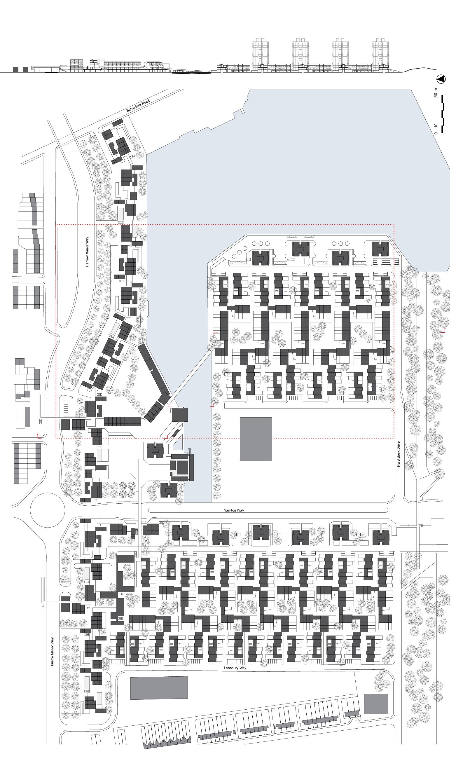 In the mid-1960s, the Greater London Council (GLC) initiated the setup of a programme and design of a New Town for no less than 60,000 people in East London: Thamesmead. After the First World War, the GLC had begun the large-scale demolition of inner-city slums consisting of Victorian back-to-back dwellings built for the working classes. This slum clearance process continued through the 1950s, 1960s and 1970s. Thamesmead was intended, among other things, for the resettlement of families from the cleared neighbourhoods. The location of the new residential area was to be the site of the Woolwich Royal Arsenal, which had fallen into disuse. This originally low-lying wetland area between the River Thames and the Abbey Wood hills had been deemed unfit for large-scale development for years due to poor soil conditions and the danger of flooding. However, lack of space and a high-pressured housing market changed all that and the location was developed despite the risks. Unlike the first generation of English New Towns, which was considered monotonous even then, Thamesmead was to become an example of the ideal New Town, with a wider variety of building typologies as well as more space for employment and services. The original 1967 master plan shows a large number of long-meandering blocks, the so-called spine blocks that form the back bone of the district: a long string of buildings along the Thames with branches going inland converging in a large central area around a marina by the river. The spine blocks created a wind and noise buffer for the low-rise neighbourhoods lying behind them, while offering a safe traffic route from the residential areas to the centre through an internal system of raised pedestrian roads. In accordance with the then prevailing opinion that the separation of traffic types through a raised pedestrian circuit would result in a safer living environment (which was also applied, for instance, in the London Barbican, see DASH – The Urban Enclave), an internal system of routes through the spine blocks was developed. In the case of Thamesmead this was in perfect keeping with the requirement that because of the danger of flooding, there were to be no residential spaces on the ground floor and escape routes had to be present at every level. The other restrictions of the location are also used to beautify the neighbourhood and make it more liveable. An intricate system of water courses was proposed for the purpose of water storage; the boggiest areas were transformed into small lakes. In advance of the construction on location, building firm Cubitts put a factory in place for the production of prefab elements to allow the quick building of a large number of houses. Only the first phase of this ambitious master plan, Thamesmead South, was realized. In accordance with the master plan, the spine blocks are situated along the north south through route in the direction of the planned centre on the Thames. The complex composition, with a lot of height differences and staggered façades and balconies, provides the blocks with a varied and expressive exterior. Located on top of the parking garage is a raised pedestrian deck flanked alternately by stacked maisonettes and one-storey dwellings for seniors. Bridges also connect the deck to the community centre by the lake and to parts of the two raised neighbourhoods behind it. Here, in a repetitive pattern of staggered short blocks, single-family dwellings are clustered around parking courts or, alternatively, green, car-free courtyards. To achieve the required housing density, a number of identical residential towers housing single or double households are situated along the fringes, some along the south shore of the lake and some along the east-west access road. In the early 1970s, high construction costs and new insights led to drastic changes in the master plan: the shopping mall, the marina and the new cross-river connection were dropped. The Cubitts factory was closed and later residential areas built in accordance with more organic home-zone principles. Thamesmead South has been struggling with a negative image for many years. As it turned out, the design ideals worked out badly in practice. The raised ground level, for instance, led to a deserted ground floor with a lot of unsafe or inaccessible areas. Only a few years after the completion of the project, the recording there of some illustrious scenes for the Stanley Kubrick film A Clockwork Orange confirmed that image. Today, many of the prefabricated concrete dwellings are highly outdated technically and some of them have passed into private hands through the ‘right to buy’ system. Overdue maintenance and the many individual additions make the neighbourhood look cluttered and neglected. The current owner of the rental housing, the Peabody Trust housing association, recently announced a major restructuring of the area. In anticipation of this, part of the original community centre by the lake has already been demolished.