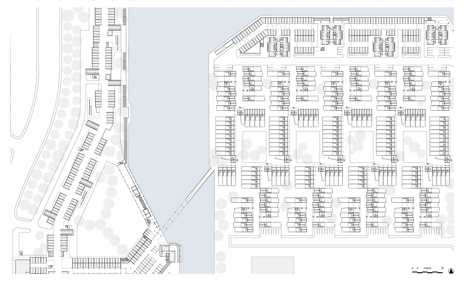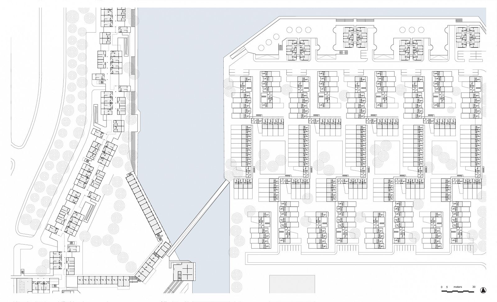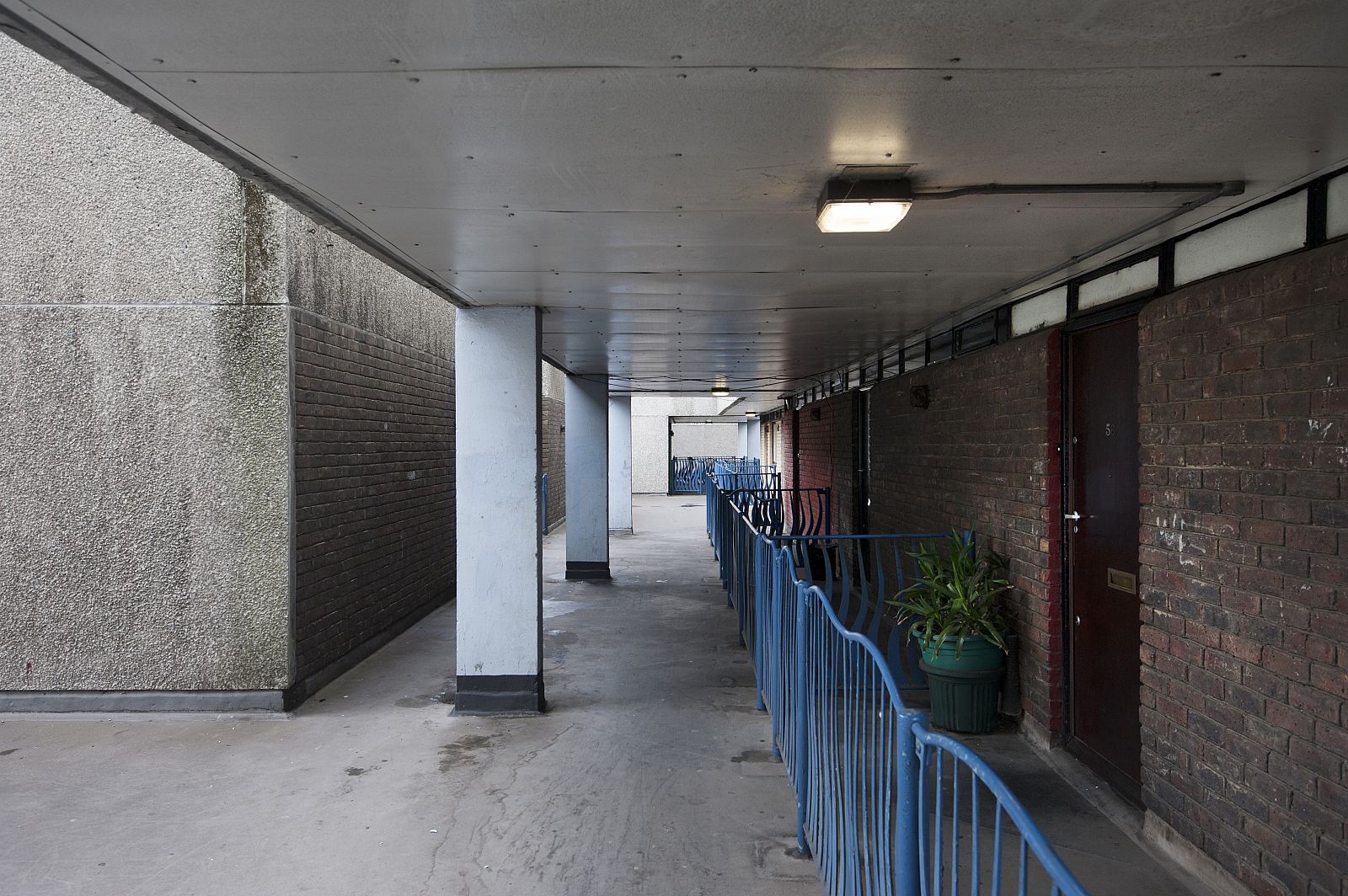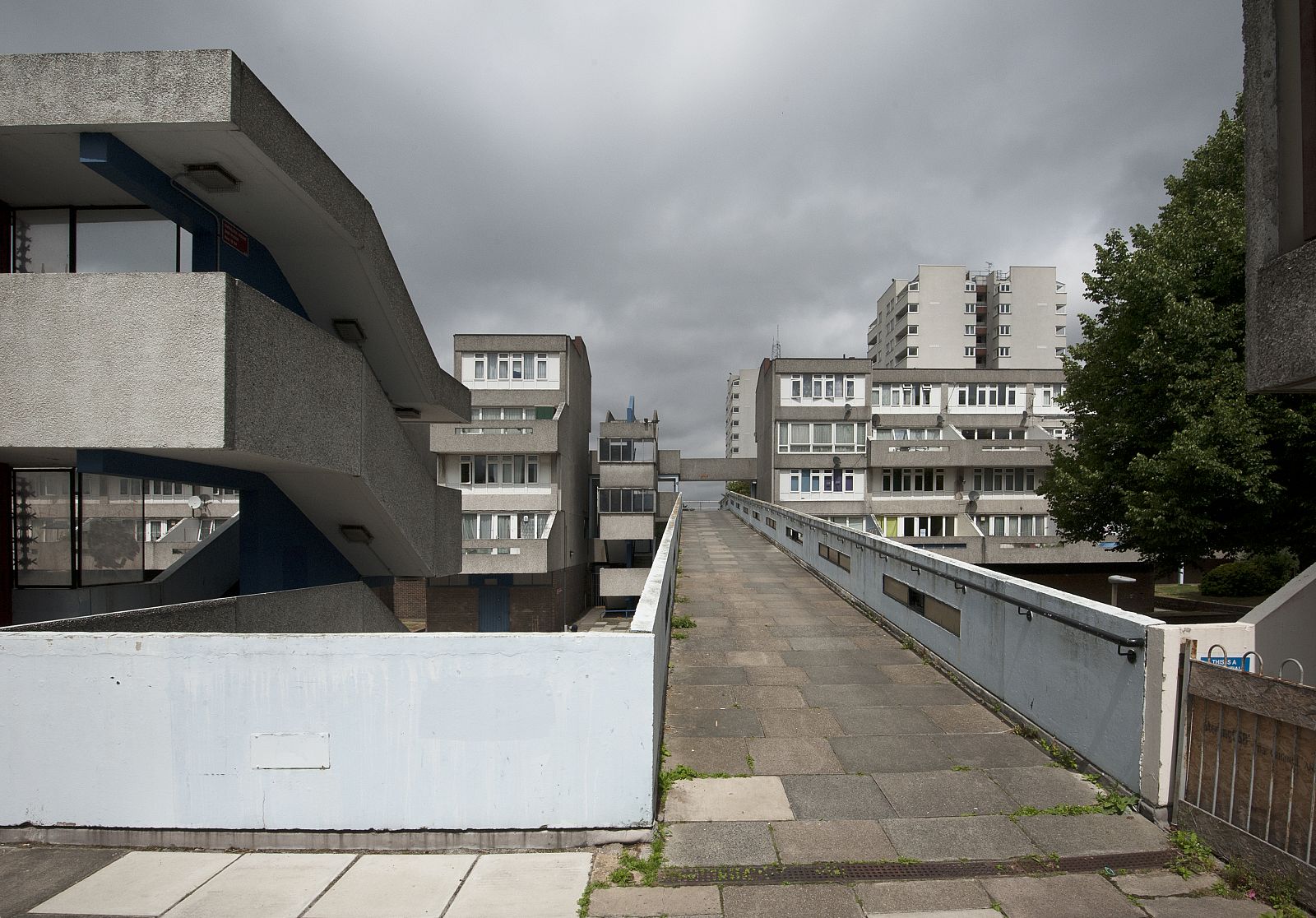 In the mid-1960s, the Greater London Council (GLC) initiated the setup of a programme and design of a New Town for no less than 60,000 people in East London: Thamesmead. After the First World War, the GLC had begun the large-scale demolition of inner-city slums consisting of Victorian back-to-back dwellings built for the working classes. This slum clearance process continued through the 1950s, 1960s and 1970s. Thamesmead was intended, among other things, for the resettlement of families from the cleared neighbourhoods. The location of the new residential area was to be the site of the Woolwich Royal Arsenal, which had fallen into disuse. This originally low-lying wetland area between the River Thames and the Abbey Wood hills had been deemed unfit for large-scale development for years due to poor soil conditions and the danger of flooding. However, lack of space and a high-pressured housing market changed all that and the location was developed despite the risks. Unlike the first generation of English New Towns, which was considered monotonous even then, Thamesmead was to become an example of the ideal New Town, with a wider variety of building typologies as well as more space for employment and services. The original 1967 master plan shows a large number of long-meandering blocks, the so-called spine blocks that form the back bone of the district: a long string of buildings along the Thames with branches going inland converging in a large central area around a marina by the river. The spine blocks created a wind and noise buffer for the low-rise neighbourhoods lying behind them, while offering a safe traffic route from the residential areas to the centre through an internal system of raised pedestrian roads. In accordance with the then prevailing opinion that the separation of traffic types through a raised pedestrian circuit would result in a safer living environment (which was also applied, for instance, in the London Barbican, see DASH – The Urban Enclave), an internal system of routes through the spine blocks was developed. In the case of Thamesmead this was in perfect keeping with the requirement that because of the danger of flooding, there were to be no residential spaces on the ground floor and escape routes had to be present at every level. The other restrictions of the location are also used to beautify the neighbourhood and make it more liveable. An intricate system of water courses was proposed for the purpose of water storage; the boggiest areas were transformed into small lakes. In advance of the construction on location, building firm Cubitts put a factory in place for the production of prefab elements to allow the quick building of a large number of houses. Only the first phase of this ambitious master plan, Thamesmead South, was realized. In accordance with the master plan, the spine blocks are situated along the north south through route in the direction of the planned centre on the Thames. The complex composition, with a lot of height differences and staggered façades and balconies, provides the blocks with a varied and expressive exterior. Located on top of the parking garage is a raised pedestrian deck flanked alternately by stacked maisonettes and one-storey dwellings for seniors. Bridges also connect the deck to the community centre by the lake and to parts of the two raised neighbourhoods behind it. Here, in a repetitive pattern of staggered short blocks, single-family dwellings are clustered around parking courts or, alternatively, green, car-free courtyards. To achieve the required housing density, a number of identical residential towers housing single or double households are situated along the fringes, some along the south shore of the lake and some along the east-west access road. In the early 1970s, high construction costs and new insights led to drastic changes in the master plan: the shopping mall, the marina and the new cross-river connection were dropped. The Cubitts factory was closed and later residential areas built in accordance with more organic home-zone principles. Thamesmead South has been struggling with a negative image for many years. As it turned out, the design ideals worked out badly in practice. The raised ground level, for instance, led to a deserted ground floor with a lot of unsafe or inaccessible areas. Only a few years after the completion of the project, the recording there of some illustrious scenes for the Stanley Kubrick film A Clockwork Orange confirmed that image. Today, many of the prefabricated concrete dwellings are highly outdated technically and some of them have passed into private hands through the ‘right to buy’ system. Overdue maintenance and the many individual additions make the neighbourhood look cluttered and neglected. The current owner of the rental housing, the Peabody Trust housing association, recently announced a major restructuring of the area. In anticipation of this, part of the original community centre by the lake has already been demolished.