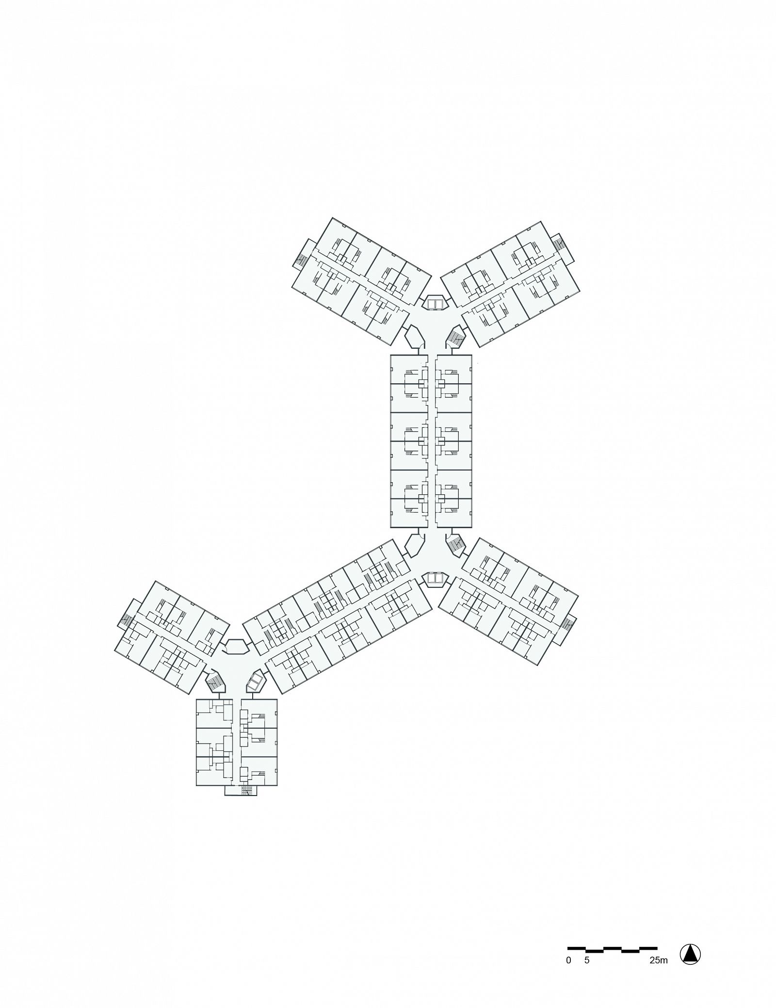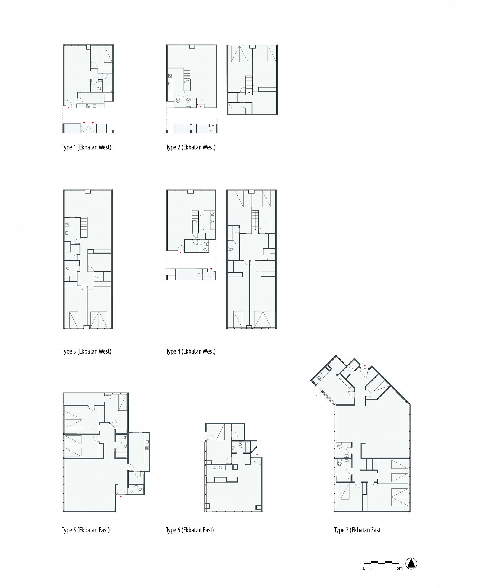 Architecturally, the main point of inspiration for this project was the Unité d’Habitation designed by Le Corbusier in Marseilles. The design consists of 33 huge concrete blocks, for which prefabricated façade panels were used in order to meet the project’s aggressive construction schedule and to create mass production of high-quality and modular housing. A motorway divides the project into two parts, of which the eastern part, containing ten regular U-shaped blocks and four long U-shaped blocks, was intended for usual governmental employees and army staff. The western side of the project, including 19 semi-hexagonal blocks, was meant for high-ranking government employees and members of the middle-class. Each U-shaped block has a three-stepped appearance, with five, nine and then 12 floors, and is raised on columns above the ground to provide a continuous landscape. The semi-hexagonal blocks, however, were constructed as freestanding objects set directly on the ground. Situated in a large green strip, the blocks have an outward uniform appearance of 12 floors, but the internal organization is unique, due to the use of various maisonette types. The series of concrete flats sit starkly in an open space and dramatically ignore the traditions of Iranian housing. In the original plan, green zones and pools were projected in the spaces between the semi-hexagonal blocks, but after the Islamic revolution these luxurious elements were not completely realized. However, a commercial area was added to Ekbatan as a new type of urban public space, which was the most remarkable influence of Gruen on this project. Although this prototype of mass housing is rooted in an ideology of modern architecture totally different from Iranian traditional architecture, Ekbatan is surprisingly considered as a successful housing project by many scholars and as a During the 1960s and 1970s, the close economic ties between the USA and Iran encouraged many American firms to develop various mega-projects in Iran. In 1966, the Iranian Ministry of Housing asked Victor Gruen to prepare a comprehensive master plan for Tehran in collaboration with his Iranian partner Abdolaziz Farmanfarmaian. Gruen’s urban theory, entitled The Heart of our Cities, is based on a hierarchy of urban structures in which the commercial centres have priority. He envisaged the metropolis of tomorrow as a central city surrounded by ten additional cities, each with its own centre. This resembled Ebenezer Howard’s Social Cities, in which a central city was surrounded by a cluster of garden cities. These ideas inspired Gruen to expand the border of Tehran and plan many new suburban residential districts. As a result of his planning, in 1968 a pilot project known as Ekbatan was commissioned by the Tehran Redevelopment Corporative Company on the west side of Tehran. Rahman Golzar and Jordan Gruzen of the American office Gruzen & Partners were asked to collaborate with Victor Gruen to design the biggest residential complex in the Middle East at the time: 15,500 housing units for about 70,000 inhabitants in an area of 221 ha. The goal of the project was to create the most modern housing project in Iran, to fulfil the Shah’s wishes to push the country towards a modern lifestyle based on Western urban planning elements, residential design and construction technologies. Simultaneously, the project was meant to control Tehran’s population patterns, to accommodate some governmental employees and to reinforce the army by providing affordable housing for its staff and their families. The construction of Ekbatan began in 1970 and the first phase was completed in 1978. Although the Islamic revolution of 1979 caused a short break in the construction process, the implementation of the second phase was continued in 1980, and finally the third phase was completed in 1992. Architecturally, the main point of inspiration for this project was the Unité d’Habitation designed by Le Corbusier in Marseilles. The design consists of 33 huge concrete blocks, for which prefabricated façade panels were used in order to meet the project’s aggressive construction schedule and to create mass production of high-quality and modular housing. A motorway divides the project into two parts, of which the eastern part, containing ten regular U-shaped blocks and four long U-shaped blocks, was intended for usual governmental employees and army staff. The western side of the project, including 19 semi-hexagonal blocks, was meant for high-ranking government employees and members of the middle-class. Each U-shaped block has a three-stepped appearance, with five, nine and then 12 floors, and is raised on columns above the ground to provide a continuous landscape. The semi-hexagonal blocks, however, were constructed as freestanding objects set directly on the ground. Situated in a large green strip, the blocks have an outward uniform appearance of 12 floors, but the internal organization is unique, due to the use of various maisonette types.