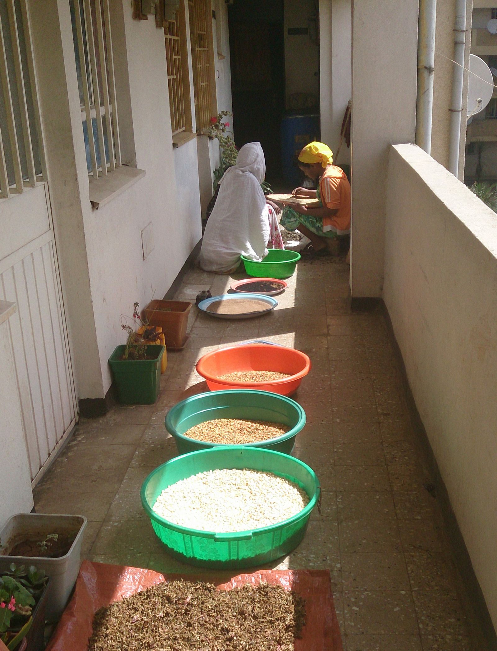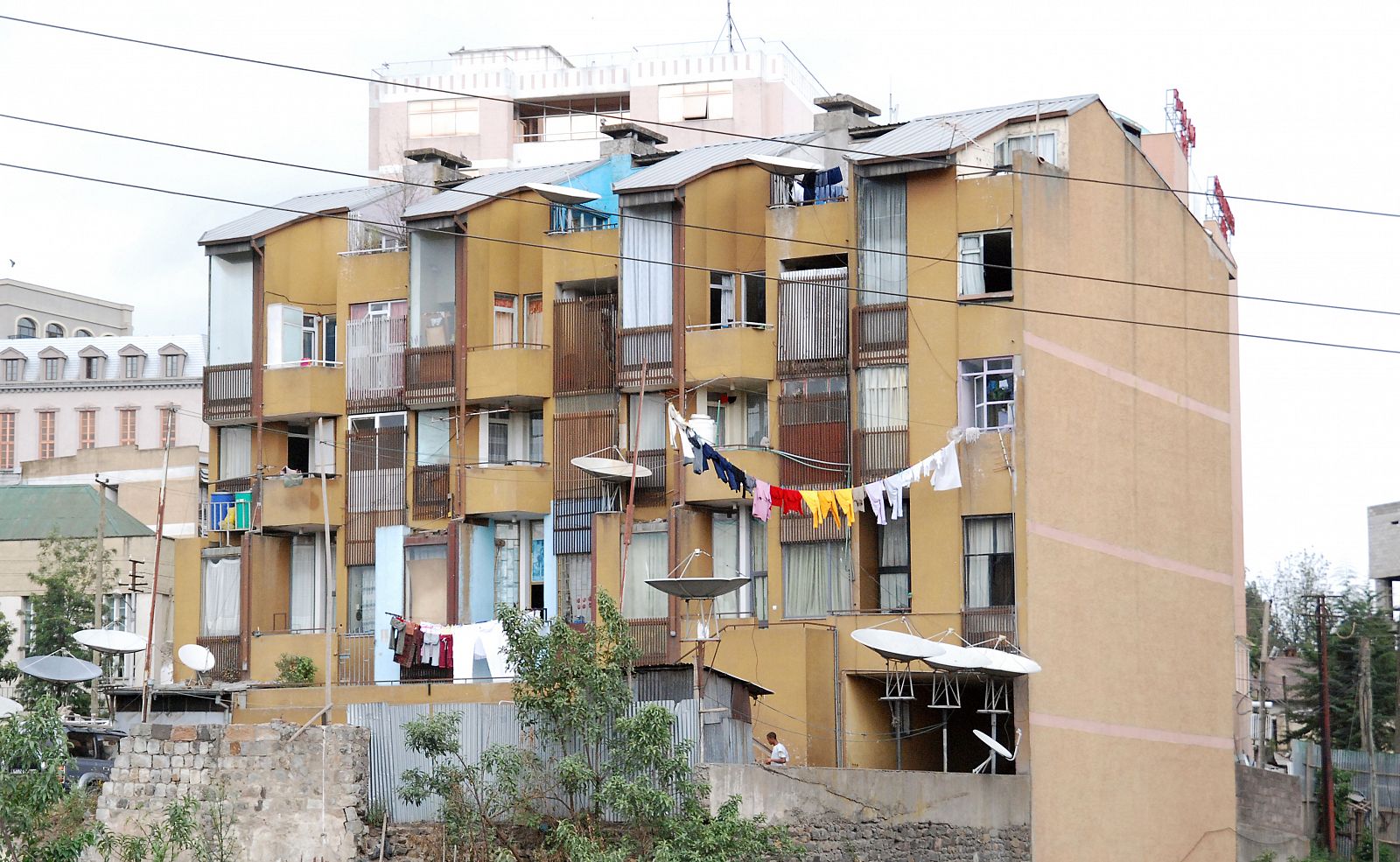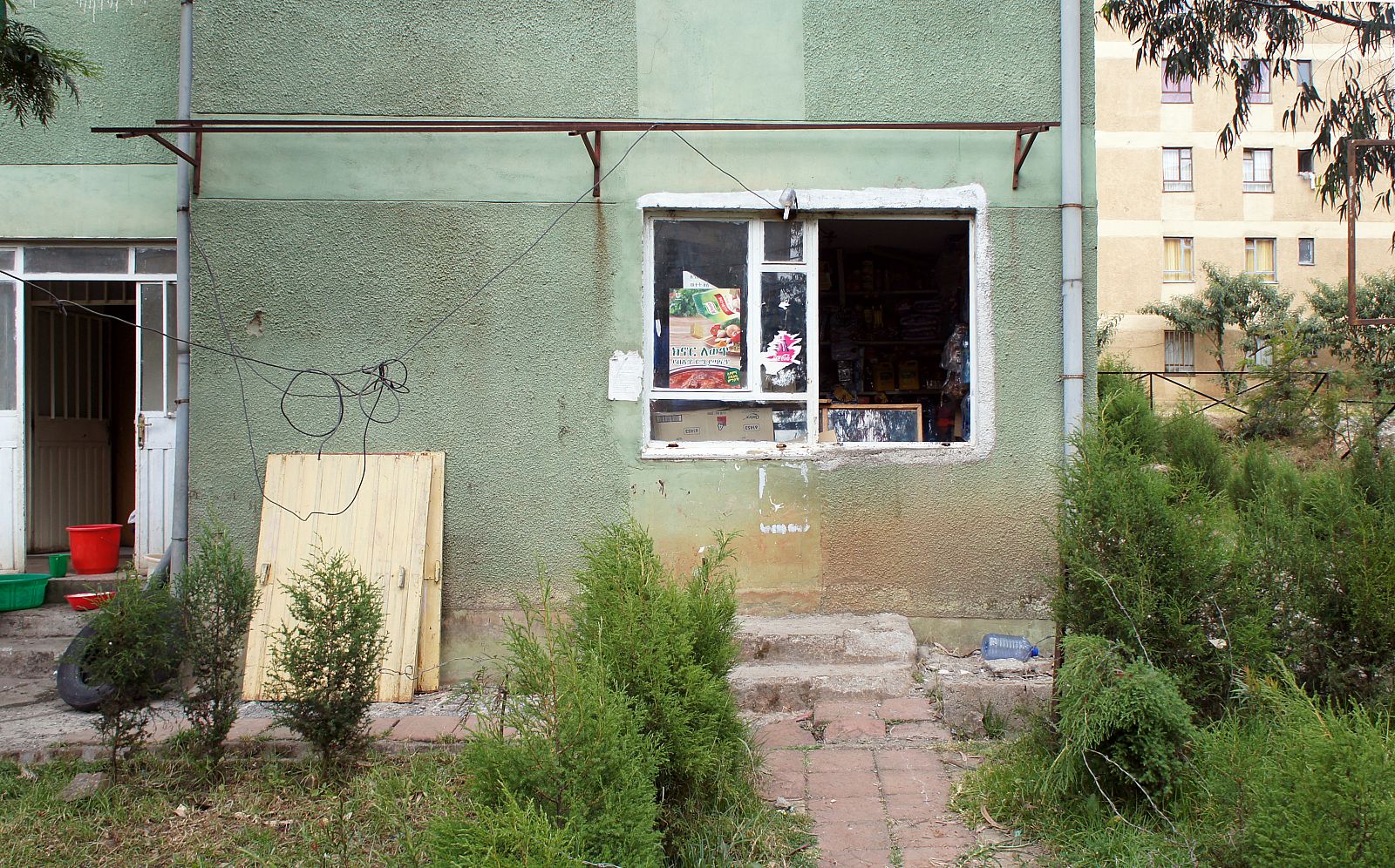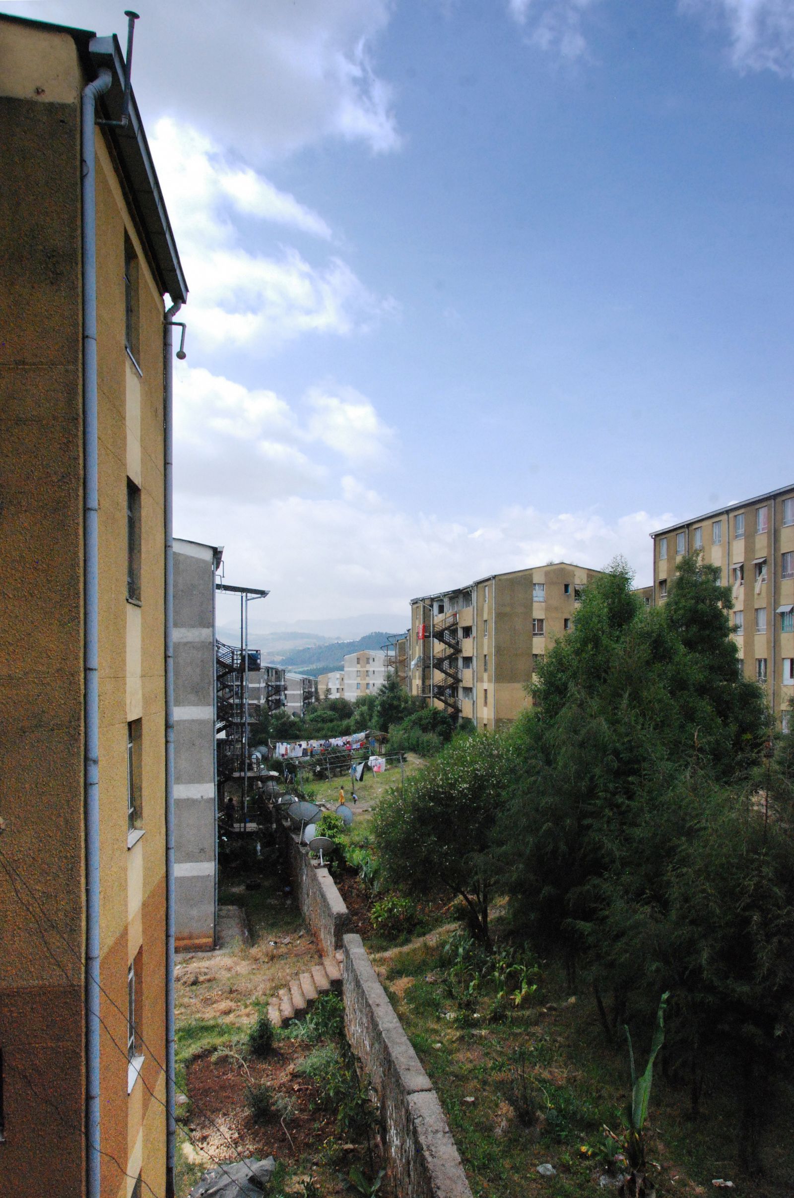 Like many social housing schemes, Mickey Leland faces the clash of architecture, program and typology with culture and lifestyle. For example, the most common way of food preparation in Ethiopia requires a cooking space in an outdoor yard. This programmatic need was translated in most condominium housing by providing a shared ‘cooking building’, but most of these cooking-buildings are not used as envisaged because of their inconvenient placement, too far away from the individual dwelling. Instead, inhabitants choose to extend their kitchen space onto the gallery, where it is further appropriated and privatized, especially for the units at the two corners of the floor. Similar examples of spatial appropriation occur on the balconies where residents extend their living spaces with simple structures. Mickey Leland is not short of open space, but it has not been designed or adjusted to meet important programmatic needs, for example parking. Since the condominiums were never envisaged for higher-income groups, the issue of parking was not addressed. Upon completion, it became obvious that the lack of parking space is problematic. Many open spaces are therefore being converted into parking lots or for example satellite-dish yards.