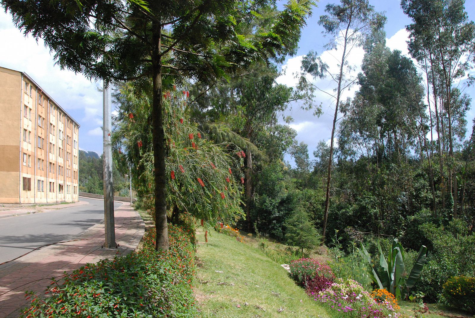 Mickey Leland is located in the north-western part of Addis Ababa, situated on a 26-ha-steep site sloping southwards. Named after George Thomas Mickey Leland – an anti- poverty activist and congressman from Texas, who died in Addis Ababa in 1989 – the housing project consists of 123 blocks with five different typologies. Every typology has slight variations, in some cases, for instance, the ground floor is filled with commercial use and in others is used for housing, depending on the location of the block within the neighbourhood. An estimated 24,000 dwellers live in the 4,800 housing units.