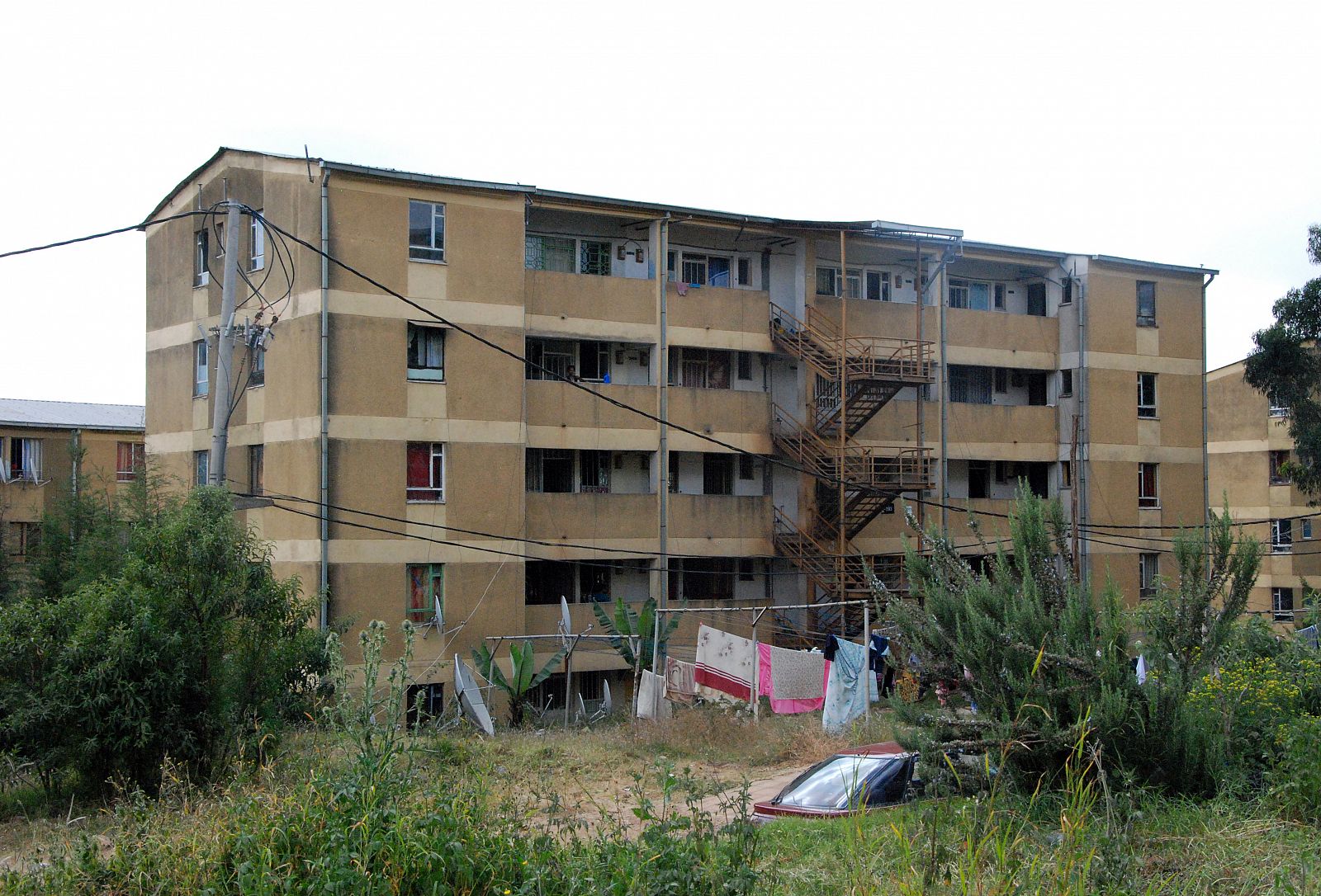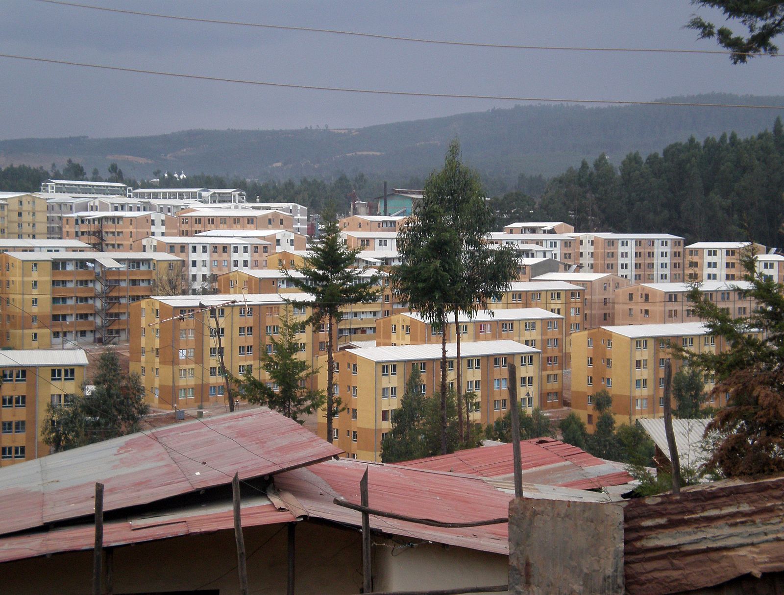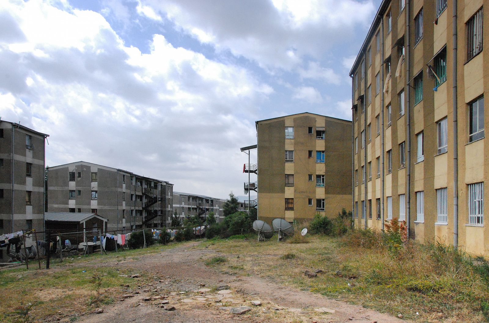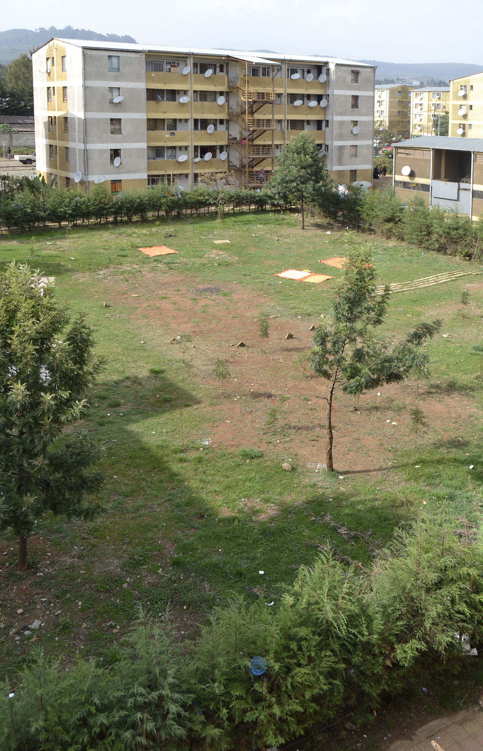 Addis Ababa, the capital city of Ethiopia, is one of the 35 fastest-growing cities in the world. According to predictions by UN-Habitat (2015), in this decade the population of Addis will grow from 4.1 to 4.9 million. Even though it is always debatable how slums are defined in Addis Ababa, UN-habitat estimates that 76.4 per cent of the total urban population lives in slums or under substandard conditions. In 2004, the Ethiopian government started the so called ‘Grand Housing Program’ to eradicate the slums and to care for the urban poor. Cross-cutting agendas here were: 1) to create 200,000 jobs; 2) to promote the development of 10,000 small scale enterprises; 3) to deliver 6,000 ha of serviced land; and 4) to enhance and build the capacity of local contractors, consultants, etcetera. Initial pilot projects were tested in the city of Addis Ababa and later the programme was scaled-up to a nationwide housing initiative. So far, in Addis Ababa alone, 240,000 housing units have been built. Mainly built as condominiums, the dwellings are infills of small vacant lots in the existing city fabric, or are a replacement for slum-cleared areas. But a large number of these condo sites are located on the fringes of the city, like the Mickey Leland Condominium Site.