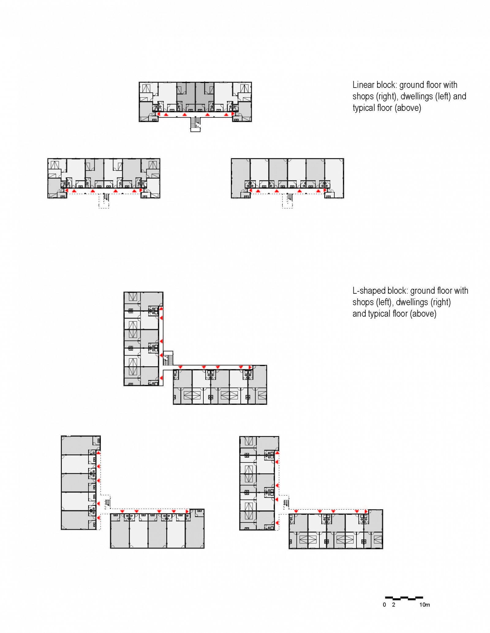 The most recurrent block typology is the so-called C5 Type, constructed with a frame of reinforced concrete (precast beams) and hollow concrete-block masonry infill. It always consists of five storeys, the maximum height for which no elevator is required. An exterior steel stairwell, placed in the middle of the façade, connects all floors and gives access to galleries, which in turn connect all units on a floor. The C5 Type consists of 40 units: ten studio units, ten one-bedroom units and 20 two-bedroom units.