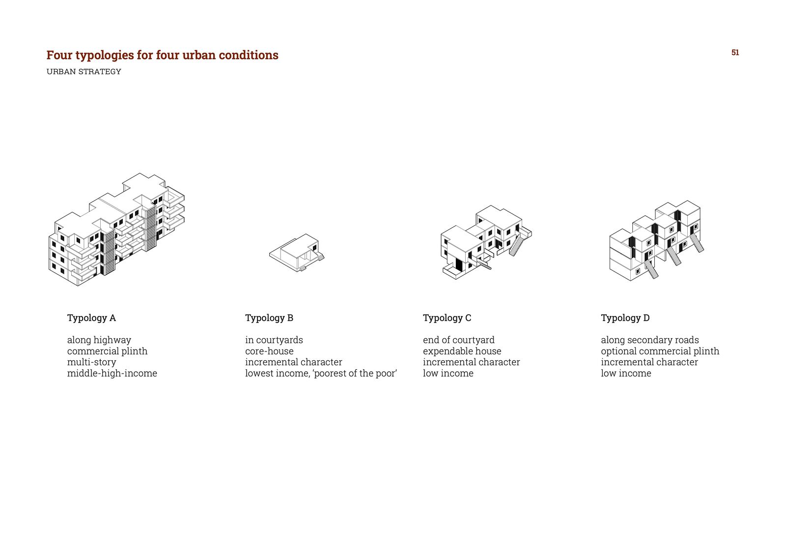 Incrementality poses one of the most promising solutions for affordable housing in the Global South. Incremental housing strategies of the past, such as sites and services, can serve as lessons on their design and management to inform contemporary models that allow for new, scalable site-specific interventions. The key factors for a successful strategy rely on the security of tenure, qualitative urban design, a base scenario with proper infrastructure, foundations, and load-bearing elements, as well as a final-growth scenario that allows for a middle-class DNA. Furthermore, bottom-up, community-organised, participatory processes should be matched with top-down, citywide planning.