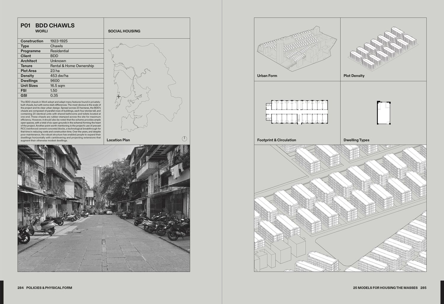 The BDD chawls in Worli adopt and adapt many features found in privately built chawls, but with some stark differences. The most obvious is the scale of the project and its clear urban design. Spread across 23 hectares, the BDD's chawls are composed of parallel rows of buildings, each four stories tall, and containing 20 identical units with shared bathrooms and toilets located at one end. These chawis are rubber-stamped across the site for maximum efficiency. However, it should also be noted that the scheme provides ample open spaces, with a total of six open grounds in the scheme forming the heart of the project. Another point worth mentioning is the project's use of precast RCC (reinforced cement concrete) blocks, a technological breakthrough for that time in reducing costs and construction time. Over the years, and despite poor maintenance, the robust structure has enabled people to expand their dwellings horizontally with cantilevering and projecting extensions that augment their otherwise modest dwellings.