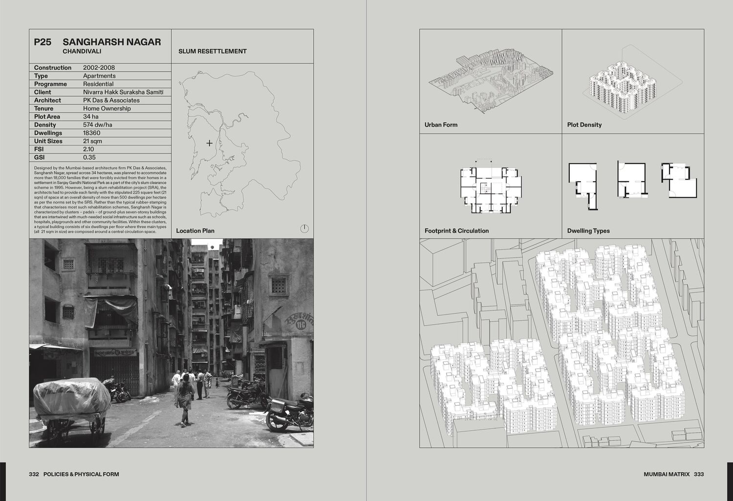 Designed by the Mumbai-based architecture firm PK Das & Associates, Sangharsh Nagar, spread across 34 hectares, was planned to accommodate more than 18,000 families that were forcibly evicted from their homes in a settlement in Sanjay Gandhi National Park as a part of the city's slum clearance scheme in 1995. However, being a slum rehabilitation project (SRA), the architects had to provide each family with the stipulated 225 square feet (21 sqm) of space at an overall density of more than 500 dwellings per hectare as per the norms set by the SRS. Rather than the typical rubber-stamping that characterises most such rehabilitation schemes. Sangharsh Nagar is characterized by clusters - pada's - of ground-plus seven-storey buildings