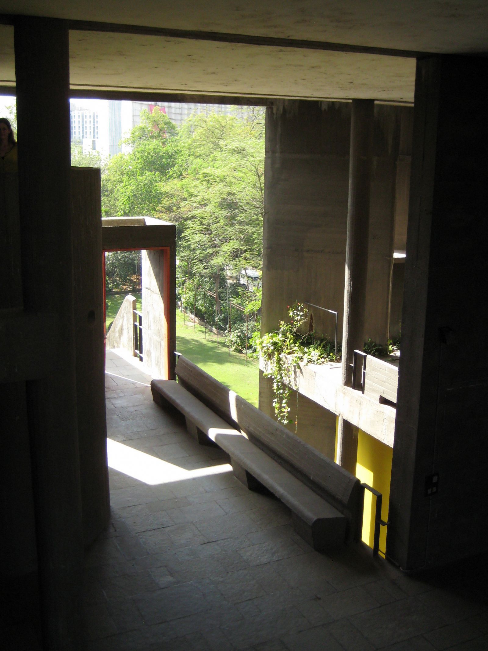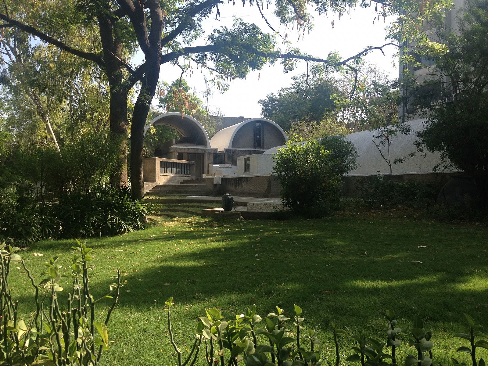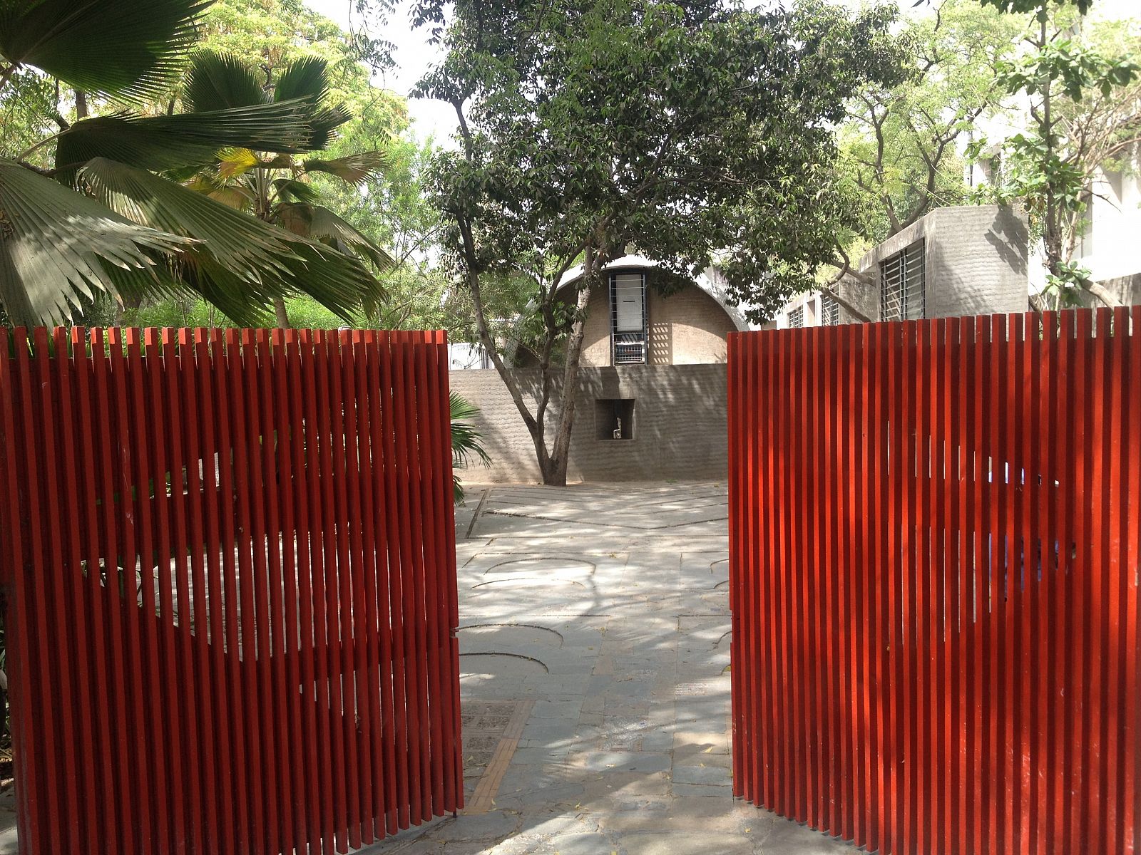 The offices of Doshi and Vastu Shilpa are in the western part of town. It is not always easy to explain its location to tuk-tuk drivers. The address is on the busy Drive In Road, just past the drive-in cinema, and the complex is also know by the name Sangath, but not all drivers know this. Underway, directions have to be fine-tuned regularly. Finally, you are dropped off on the side of the road near a grey stucco garden wall. Once you have entered through the orange-red gate in the garden wall, a big surprise awaits you. After the noise and the dust of the busy Drive In Road, which takes you from the ancient town centre and over the Sabarmati River to the western periphery of the expanding city, you suddenly find yourself in a green oasis. A garden path with carefully inlaid patterns of recycled ceramic shards takes you by lush greenery and a pond in the direction of a collection of white barrel vaults to one side in the back of the garden. A couple of steps take you down to a shaded porch before you actually enter the building.