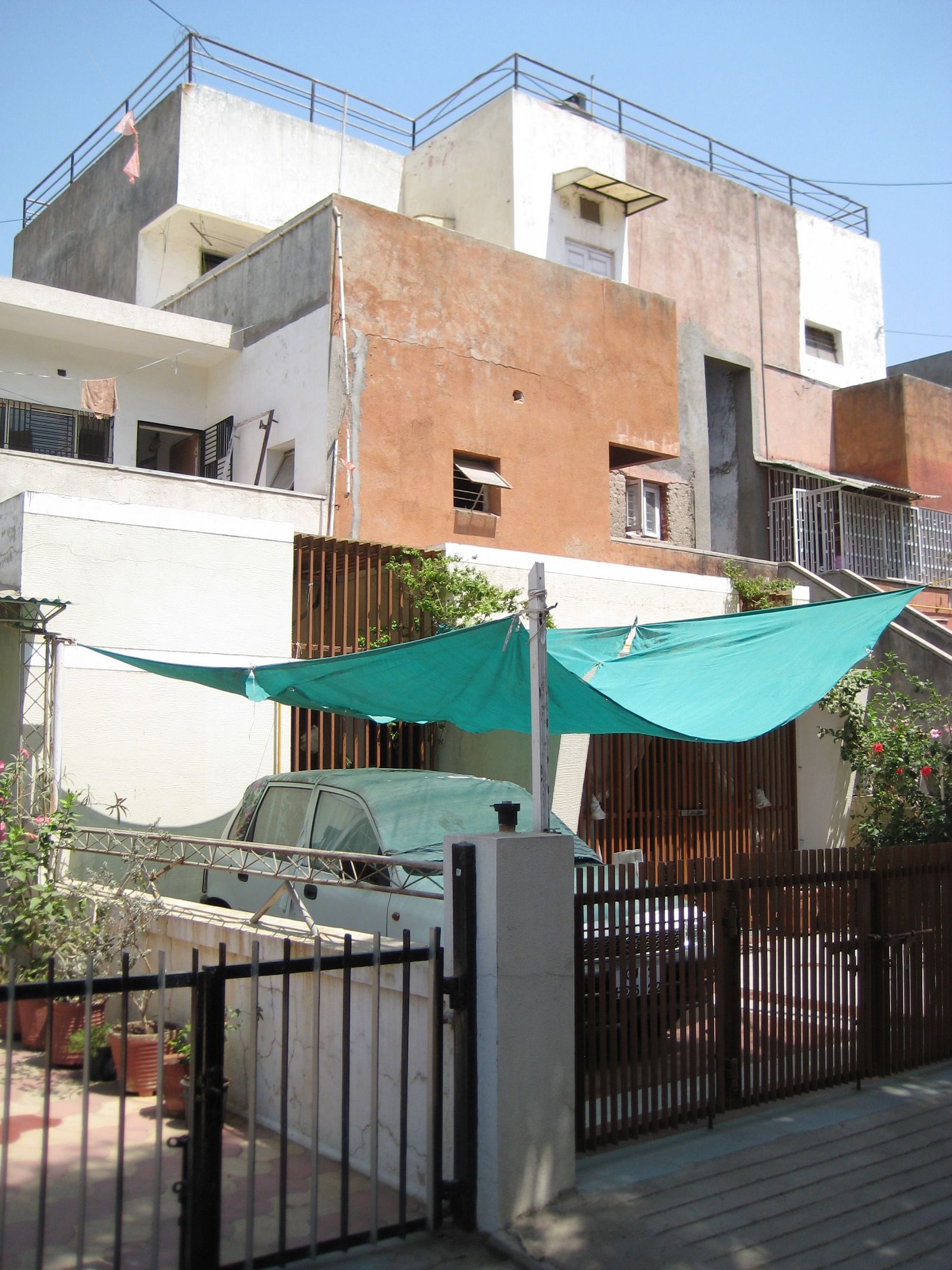 More than anyone else who attended the Team 10 meetings, Doshi managed to actually incorporate the idea of an ecological habitat, which was the foundation of Team 10 and included as such in the 1954 ‘Statement on Habitat’, the so-called ‘Doorn Manifesto’, in his housing projects.12 In the Indian context, ideas regarding growth and change could not but become a natural part of Doshi’s design strategies to house the lower classes. His work, from his earliest projects for cheap housing in Ahmedabad for ATIRA (Ahmedabad Textile Industry’s Research Association) and PRL (Physical Research Laboratory) in the late 1950s to his famous Aranya project in the 1980s, for which he received the Aga Khan Award, represent a continuous development of simple basic rules that accommodate growth and change generated by the residents themselves. Subdivision and a very simple core including basic sanitary facilities are the most minimal necessities for a development that is completed and enriched by the residents themselves. The neighbourhood literally grows through the development of and investments by the community. Extra rules may involve zoning for the fleshing out and further development of the basic lots or a first cell as a first main space perhaps combined with a kitchen and a private patio beyond. Where housing projects require a greater density, the dwellings are stacked. Collective outside stairs regulate the direct contact with the street. Doshi never included the galleries or raised streets that were once so popular among European Team 10 colleagues in his projects. His are always high-density low-rise developments. The rhythm of the lots, the repetitive basic structure of the access roads, the private and public spaces, the correct connection to the residential paths or roads, the proper positioning of the collective outside stairs: they all contribute to the creation of a cohesive tissue that is open to appropriation and further expansion by the residents. In Ahmedabad, the same principles can be found in Doshi’s housing project for the Life Insurance Corporation (1973-1976), which includes numerous changes and additions made by the residents.
