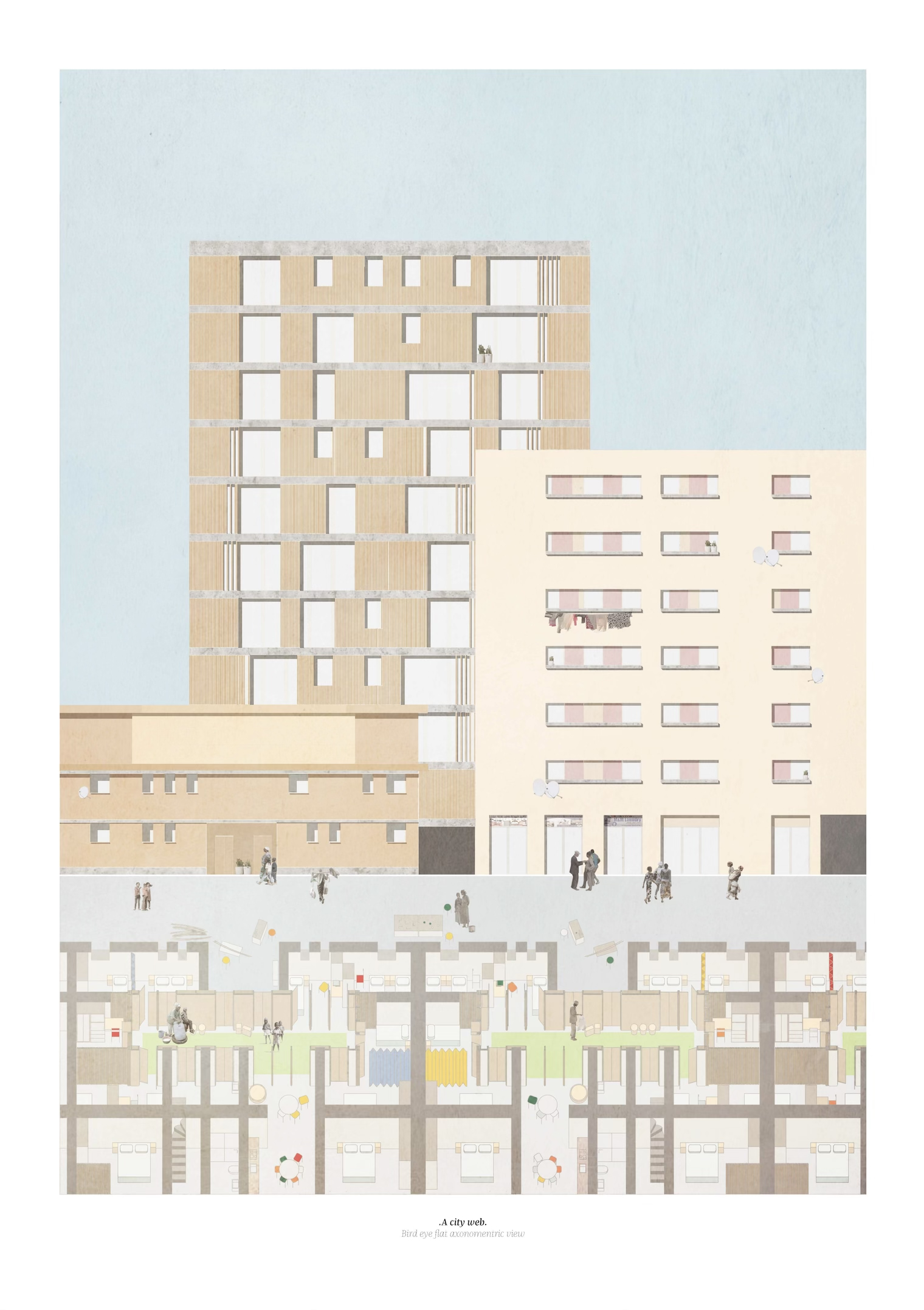 The low-rise housing blocks are then located in the openings and in-between spaces of the web of connections. A great attention is put on the threshold as a space of transition between public and private, the inhabitants have the possibility to use it as a working or a selling space, activating and extending the life in the small roads inside the neighbour.