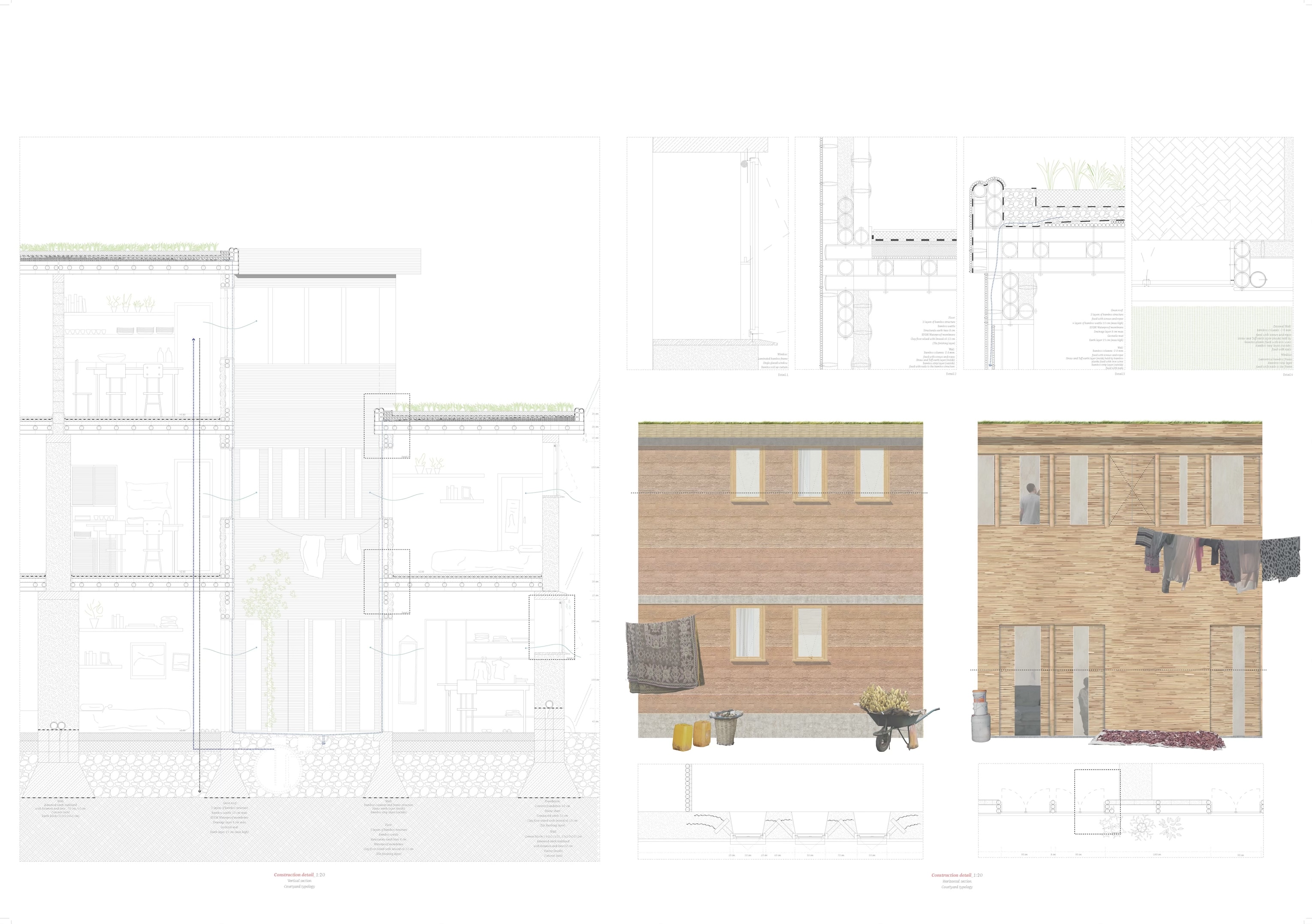 The development of the strategy start from a grid, that has the capacity of accomodating multiple and particular developments and open spaces while maintaining a certain general logic. The result is a web of connections in which the gradual transition between public and private domains becomes clear in the succession of main streets, alleys, patios and dwellings. The continuous pedestrian connections, open spaces and public amenities which constitute the locus of collectivity, site of meeting, trade and play. Two main pedestrian roads connect vertically this neighbour to the others around. These two streets lead to two main open spaces, that are defined by the middle/high-rise developments. These open spaces host playgrounds, meeting points shaded by trees, water points, and multifunctional bamboo structure that, with the temporary addition of textile and bamboo planks, can be uses as market stalls, performance places and and as morgue. Moreover, the ground floor of the middle-rise buildings houses public functions, such as educational, cultural, social and commercial activities that activate the porch and the the open spaces around.