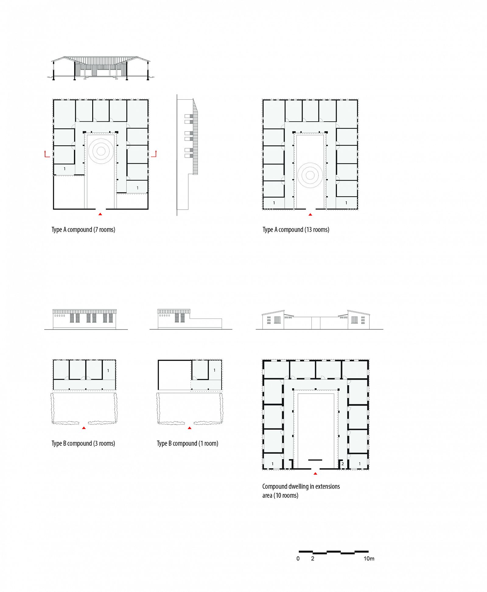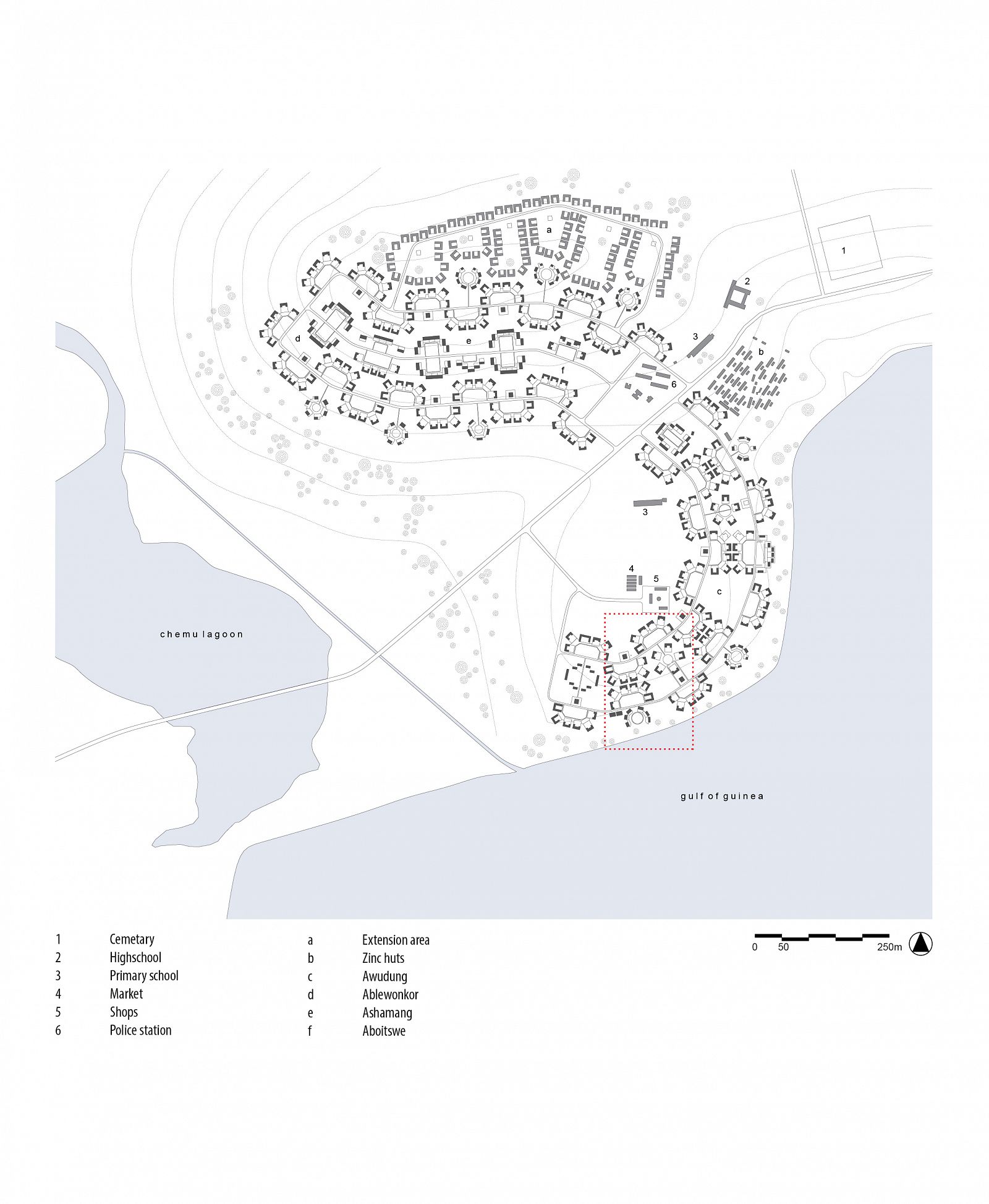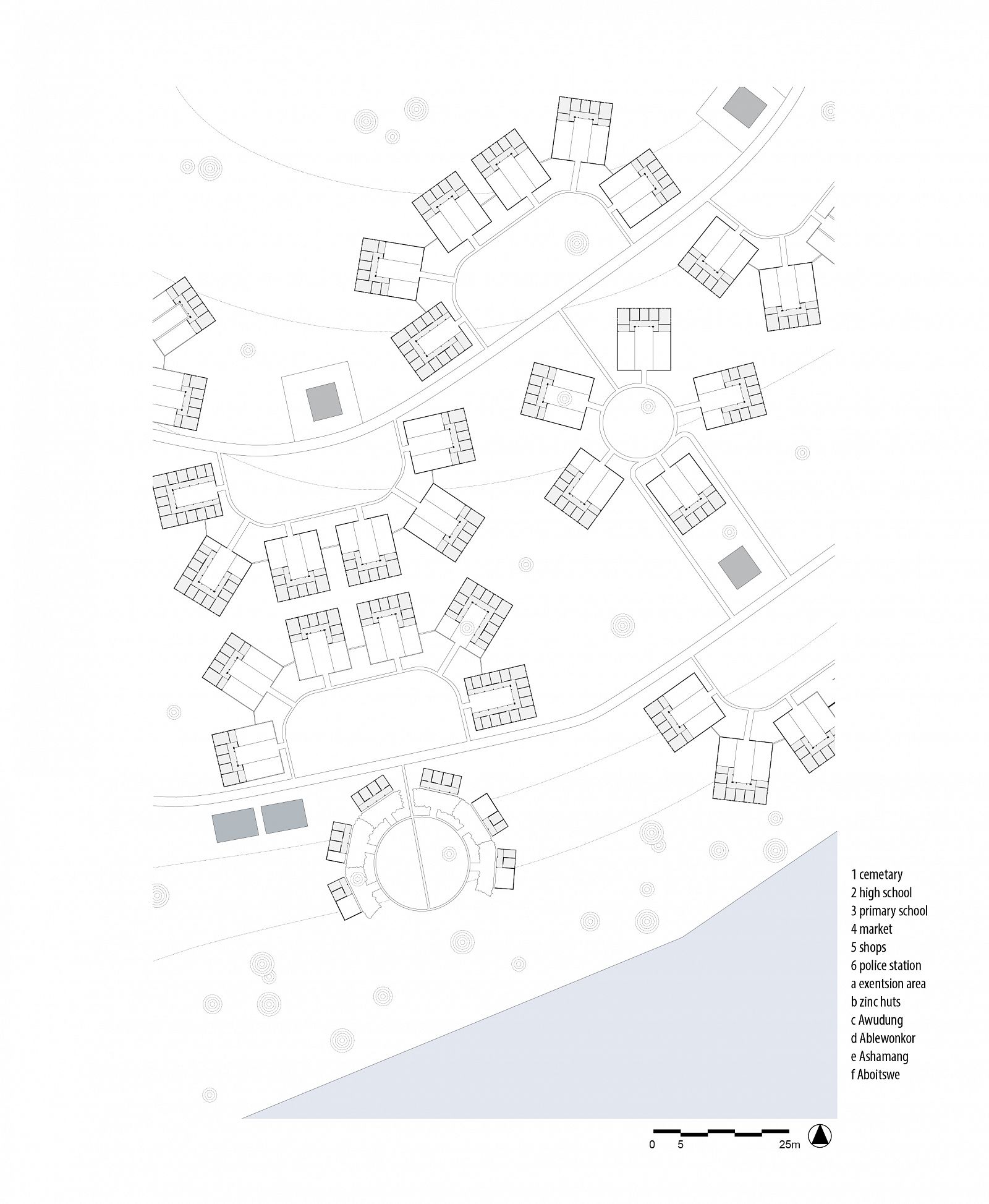 After an initial plan, which was rejected by the villagers, Fry and Drew designed the new village based on the hierarchical organization model of an English New Town. It consisted of four neighbourhoods and one central area; functions were zoned. All the institutions of the ‘modern welfare state’ were placed in the centre: the schools, shops and a marketplace, as well as the chief’s palace and a fish smoking area. The houses were designed to accommodate traditional compound-style living with extended families. Their layout was flexible, so families could enlarge the number of rooms themselves. The houses consisted of a series of repeating standard types of circular, rectangular, diamond and star shaped compounds. A sanitary block with toilets, centrally located in the neighbourhood, was shared by two or three compounds (160-600 people).The original design of the houses, of which a prototype had been built, contained a flat roof. Since the villagers deemed this to be ‘only fit for pigeons’ and not dignified enough, the design was changed into pitched roofs.